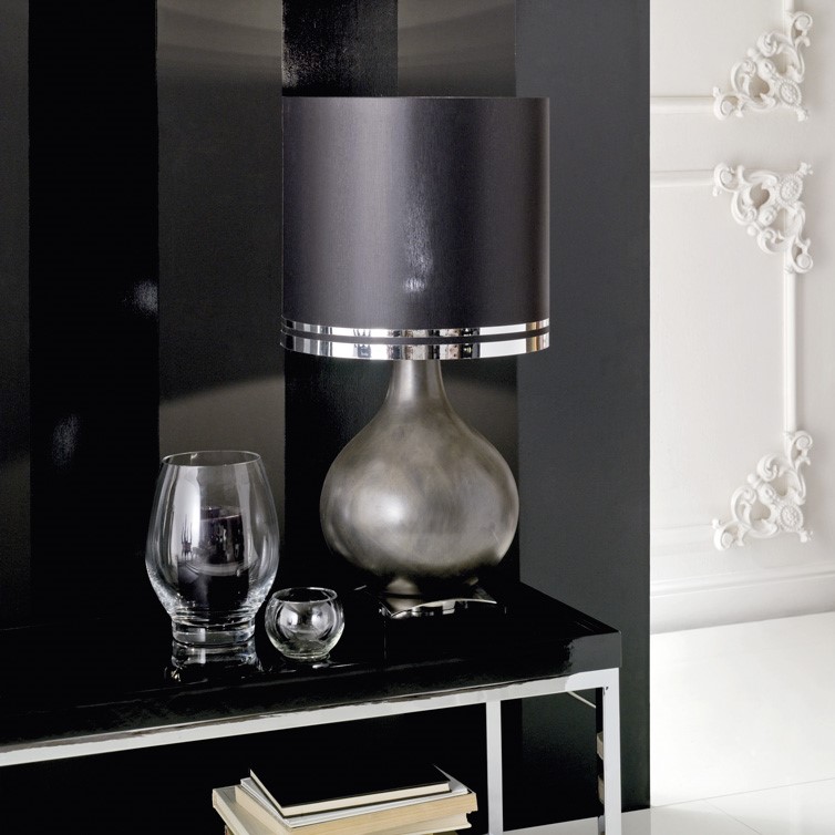 Hand glazed majolica lamp. Chromed bronze casting and glossy- black lacquered wooden base. Black chintz lampshade with silver inside and silverfoil bands.