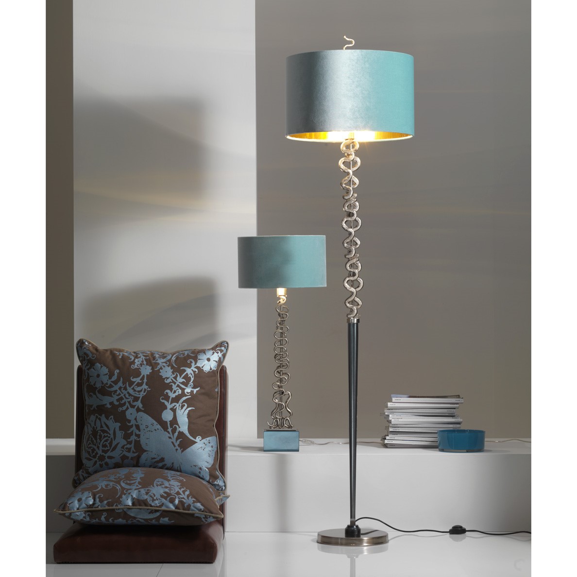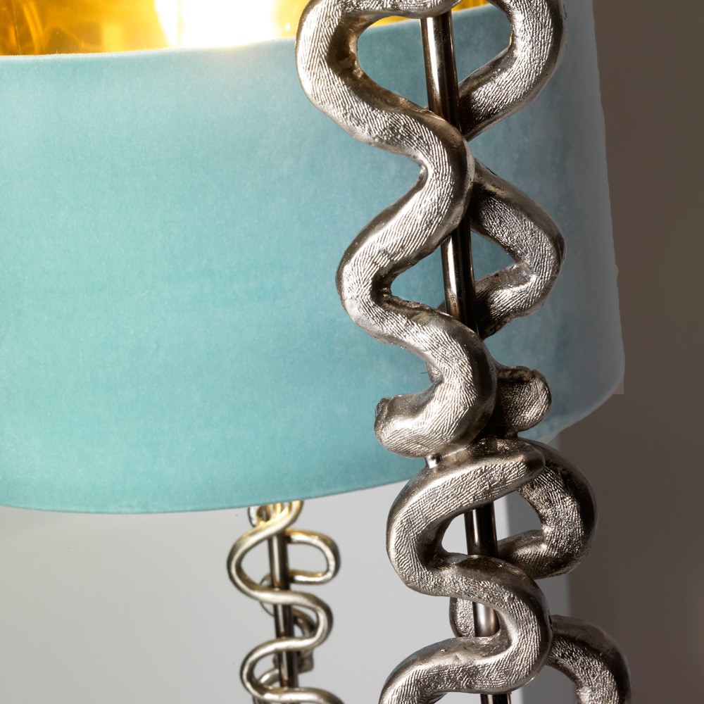Bronze table lamp with brushed, coated chromed finish. Pearly azur lacquered base. Silk velvet lampshade with golden inside.