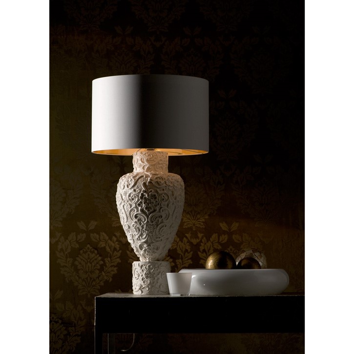 Hand engraved and glazed majolica lamp. White chintz lampshade with golden inside.