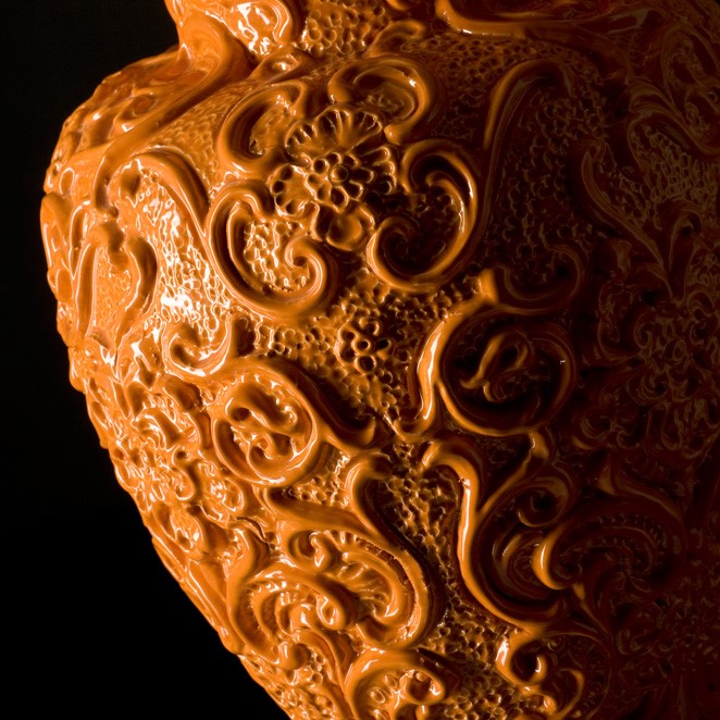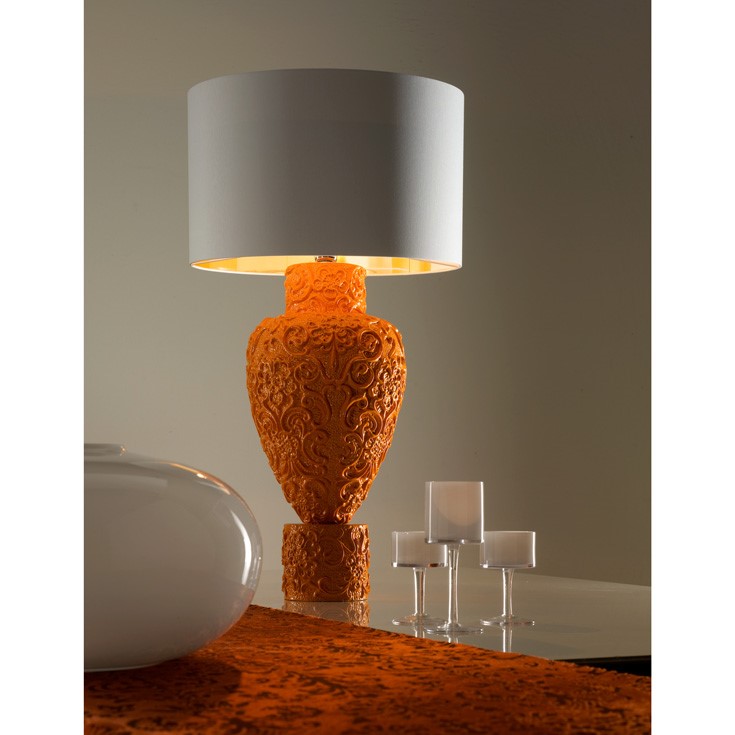 Hand engraved and glazed majolica lamp. White chintz lampshade with golden inside.