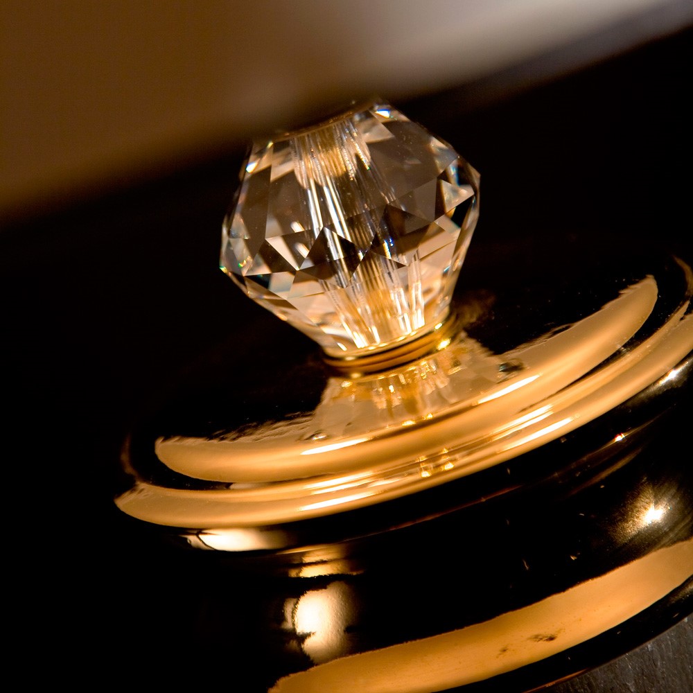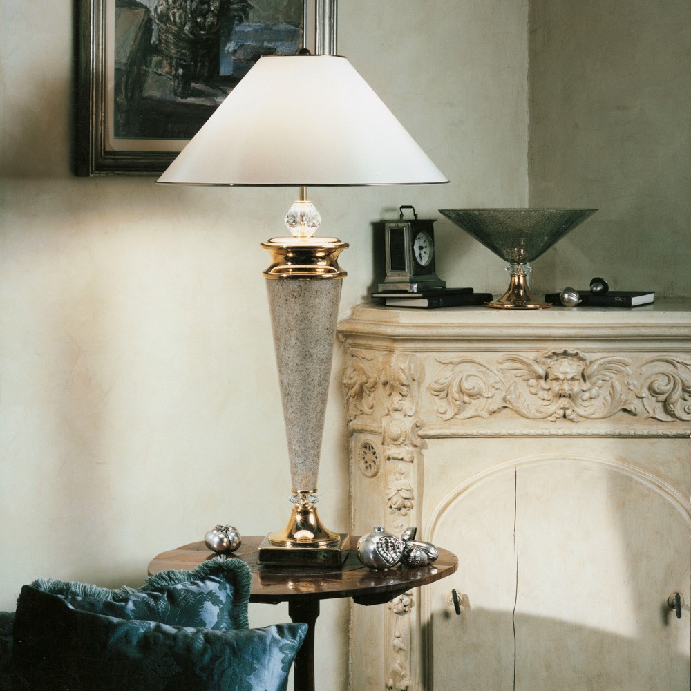 Lamp in glass and majolica, gold plated. Crystal details and ivory taffeta lampshade.
