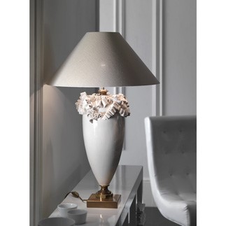 This table lamp belongs to our ribbon collection and is formed by a majolica body, the ribbon, always in majolica that is skillfully handmade by our workers who give it that artistic and unique aspect that has this piece. Assembled with burnished brass details. The lampshade is in linen silk coupled on a golden foil making the linen texture more precious. The workmanship that makes it unique in its simplicity still makes them have that clean line that contextualizes it both in classic and contemporary environments.