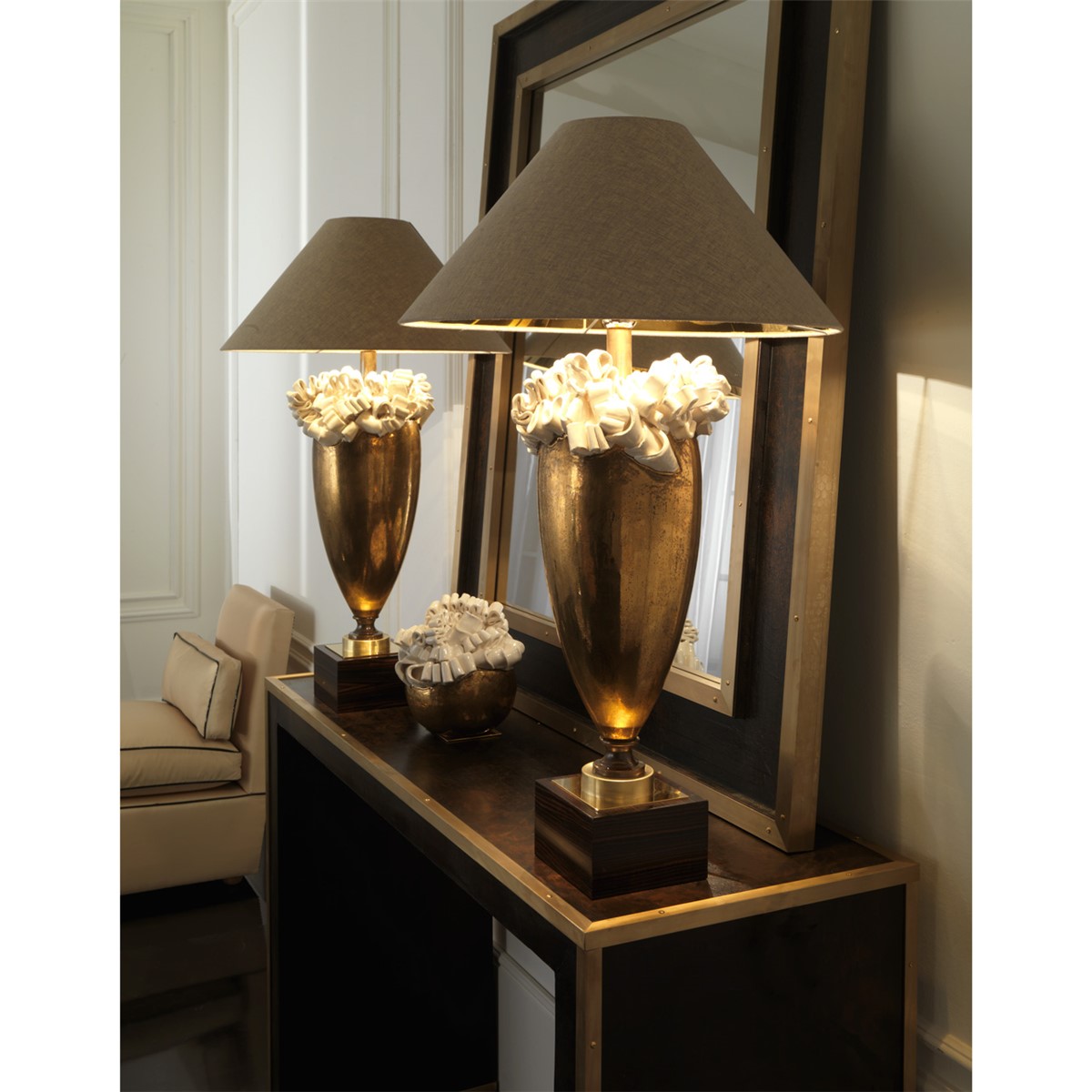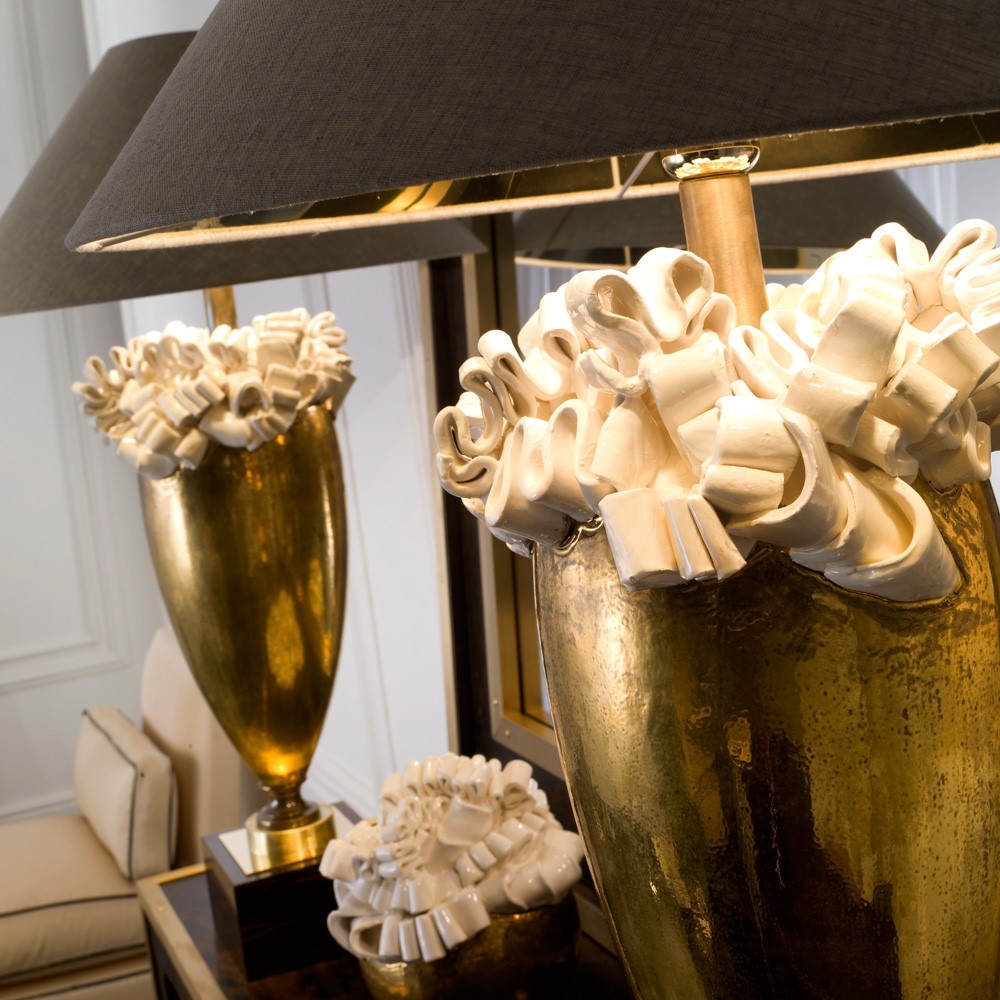 Lamp in real gold plated, hand shaped and glazed majolica. Burnished brass details and ebony makassar base. Beige silk linen over gold lampshade.