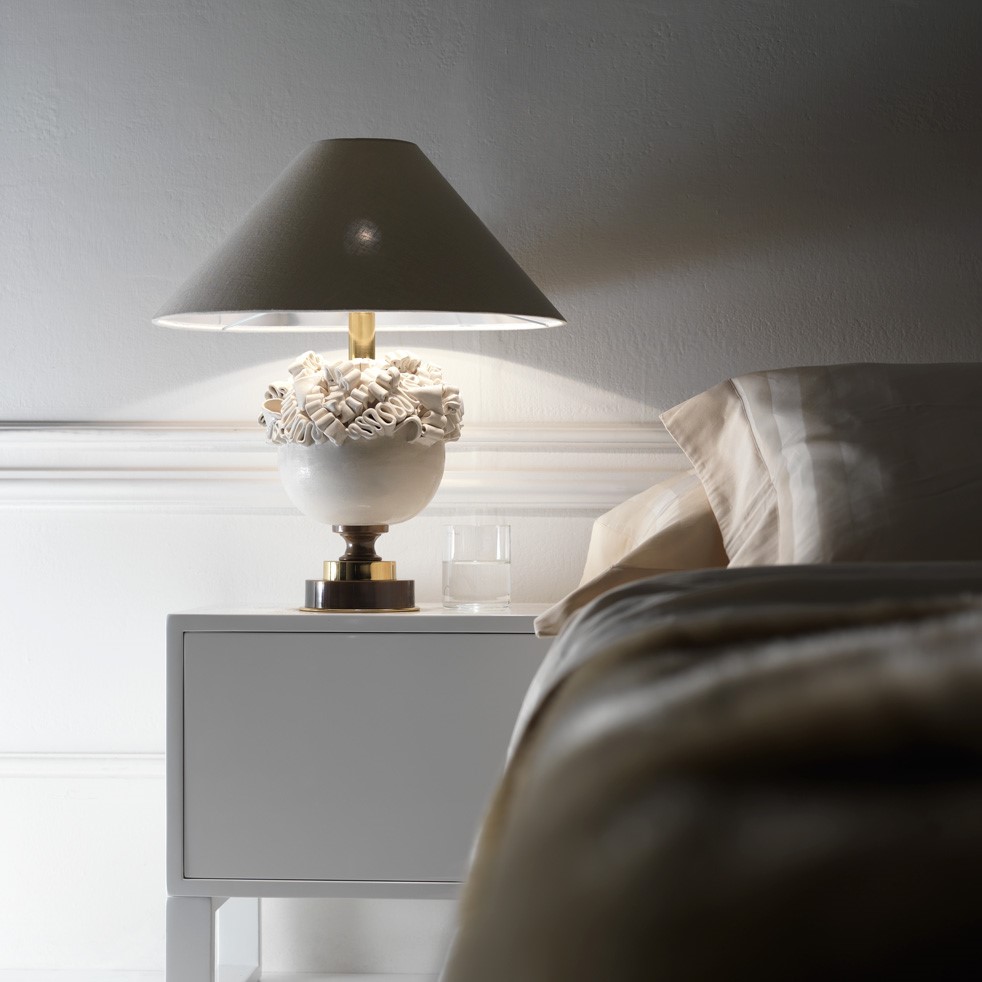 Hand shaped and glazed majolica lamp. Burnished brass details. White silk linen over gold lampshade.