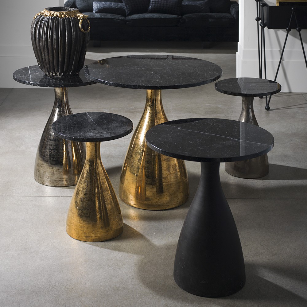 Coffee table in aged plated pure gold majolica. Top in black marble marquinia.