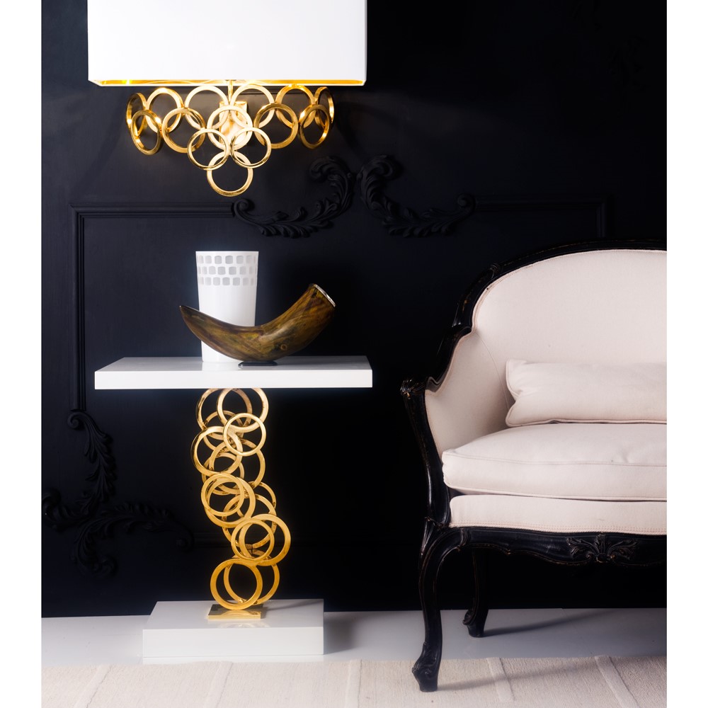 Small table with ivory/gilded, lacquered wooden base and top. Brushed and gilded iron shaft.