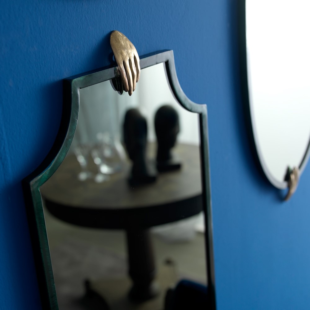 Set of mirrors, with small hand shaped decorations, made of bronze casting. Brushed metal frames, fumé blue, green and brown lacquered.