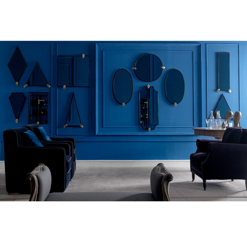 Set of mirrors, with small hand shaped decorations, made of bronze casting. Brushed metal frames, fumé blue, green and brown lacquered.