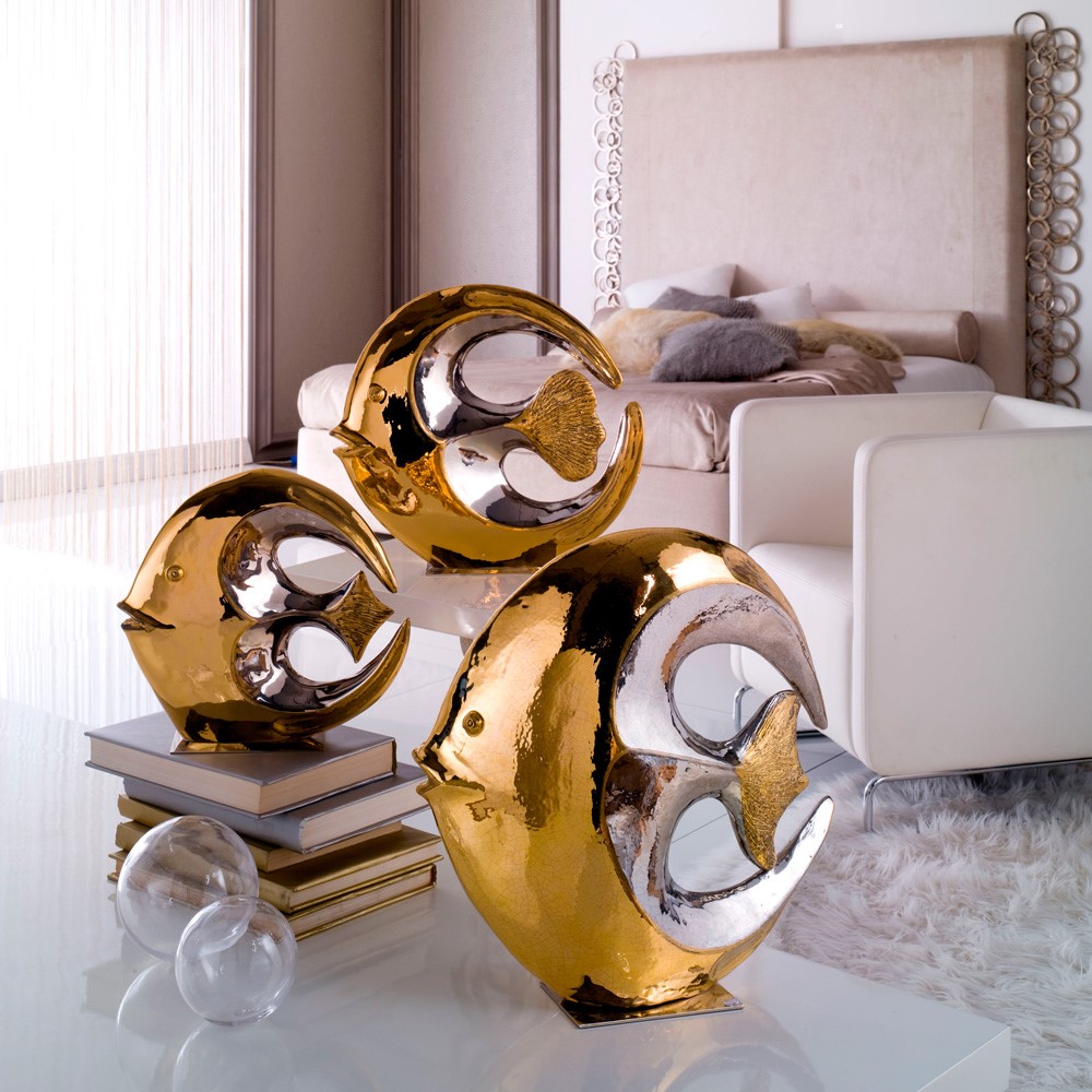 Real gold and platinum plated, hand engraved majolica fish. Chromed brass base.