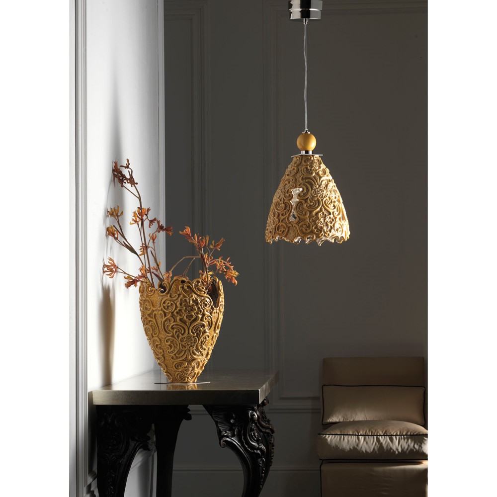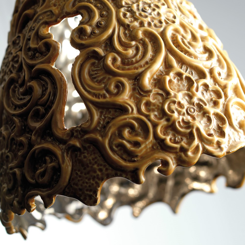 Descending light with hand engraved and glazed majolica cup, platinum plated inside. Chromed brass details.