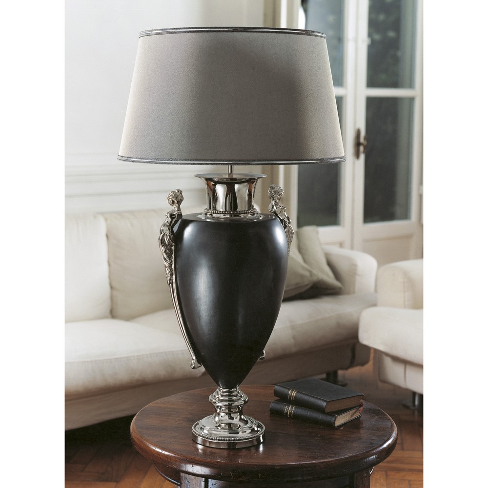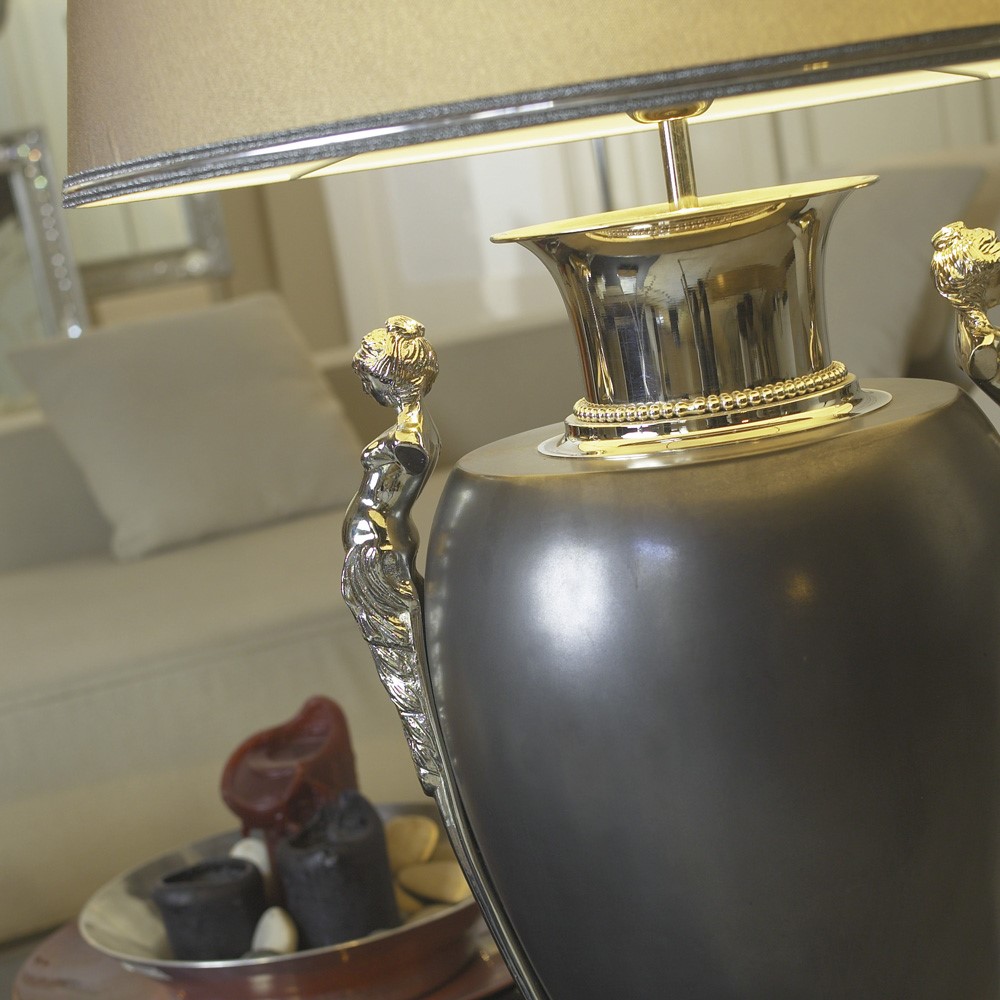 This table lamp has a classic taste but its clean line and the chosen finishes make it suitable for a contemporary style. Composed of a central body in enameled majolica matte pewter which are then combined with brass runs with welded a fine pearl brass talking. The handles are a real fusion jewel of bronze, fused but then chiseled all by hand. The combination of nickel and pewter manages to make this lamp refined and elegant. The lampshade is a refined grey finished with silver edge.