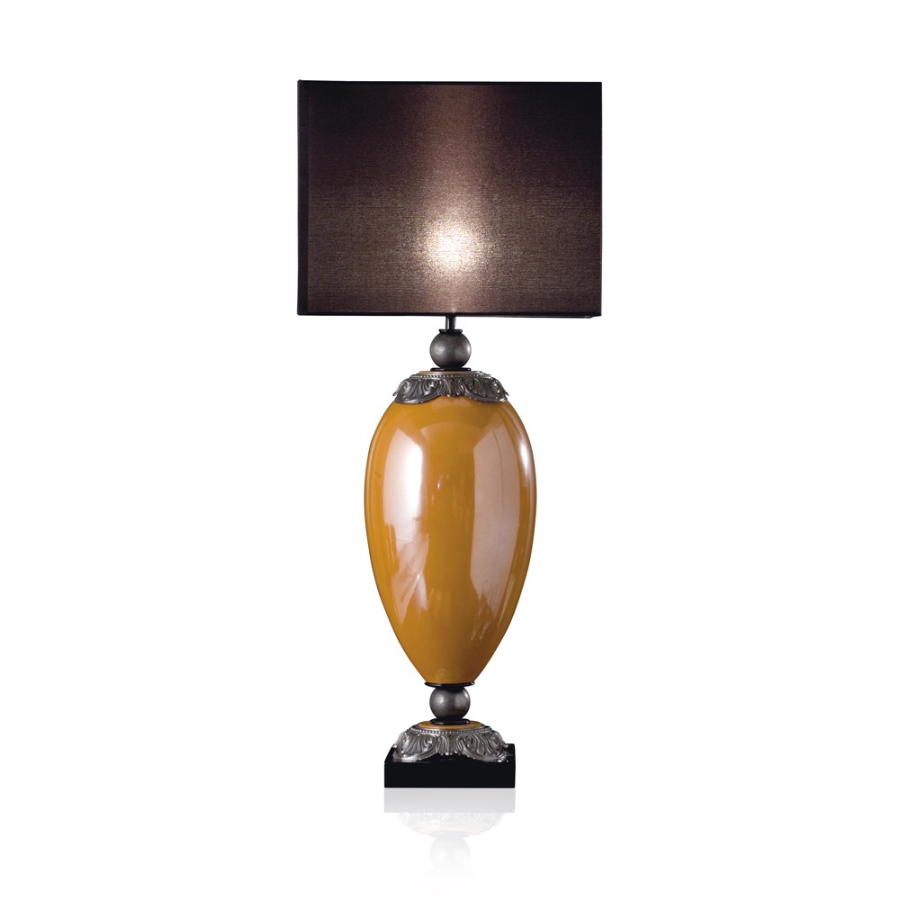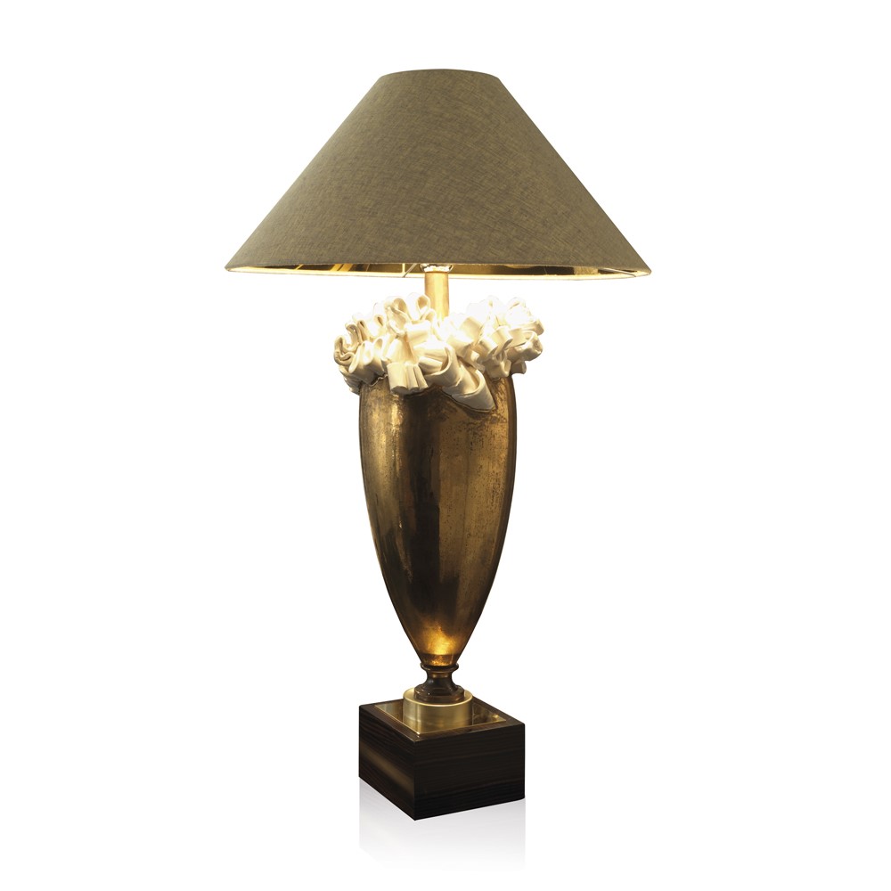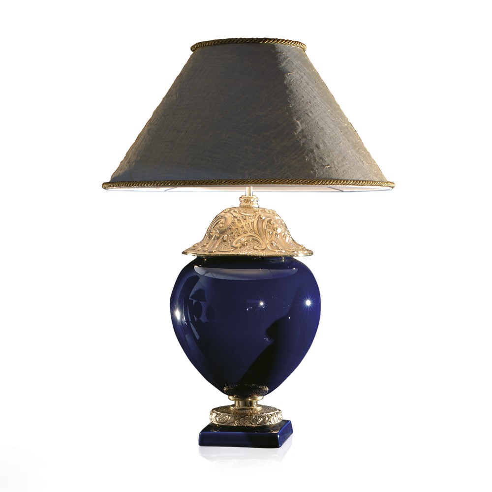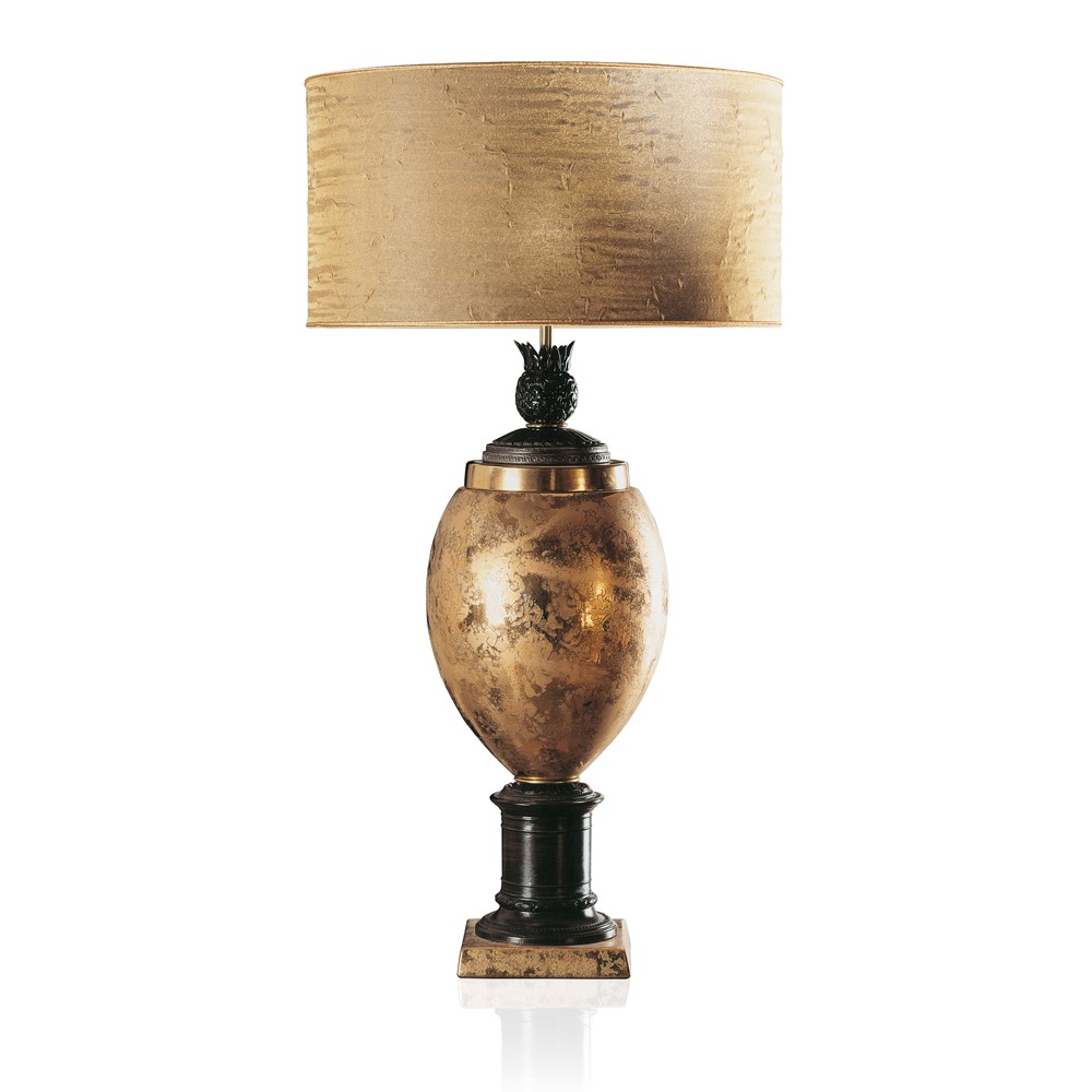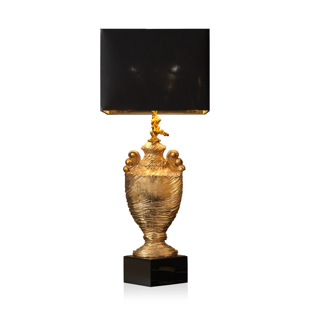 Lamp in real gold plated, hand engraved majolica. Brass and bronze details. Glossy-black lacquered wooden base. Black chintz lampshade with golden inside.