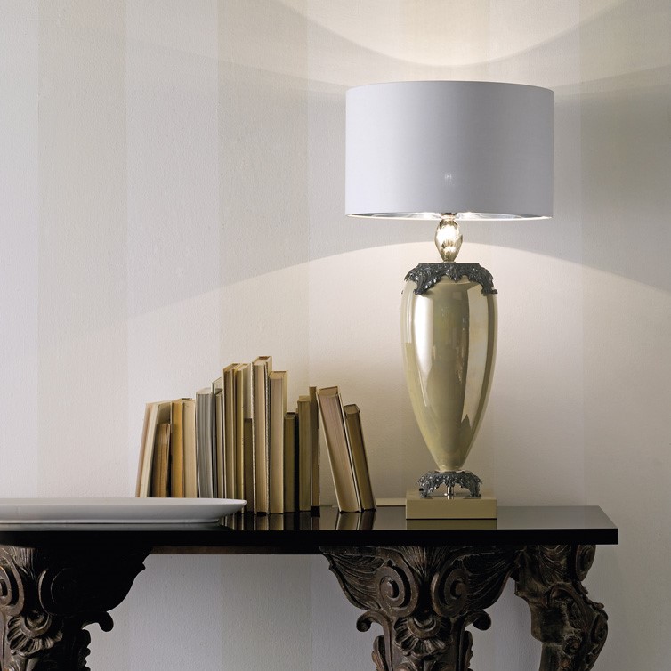 Hand glazed majolica lamp. Pewter colour and chromed bronze details. Smoky, hand cut crystal. Shiny lacquered wooden base. White chintz lampshade with silver coloured inside.