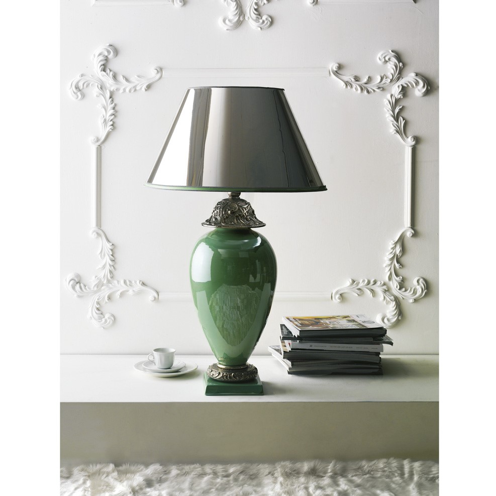 Lamp in platinum plated, hand engraved and glazed majolica. Silver foil lampshade.