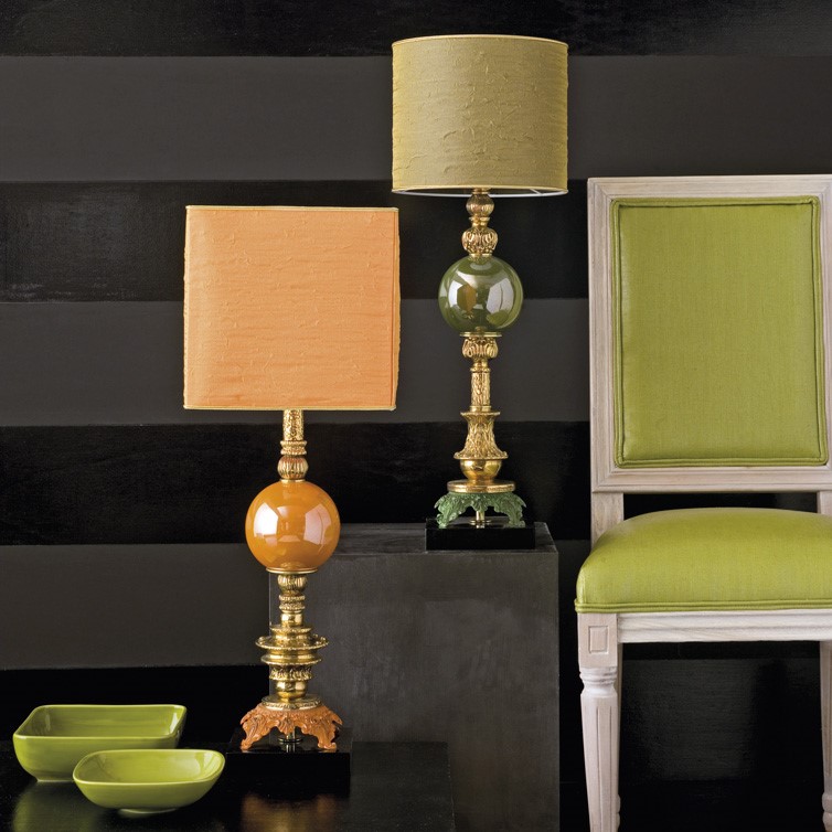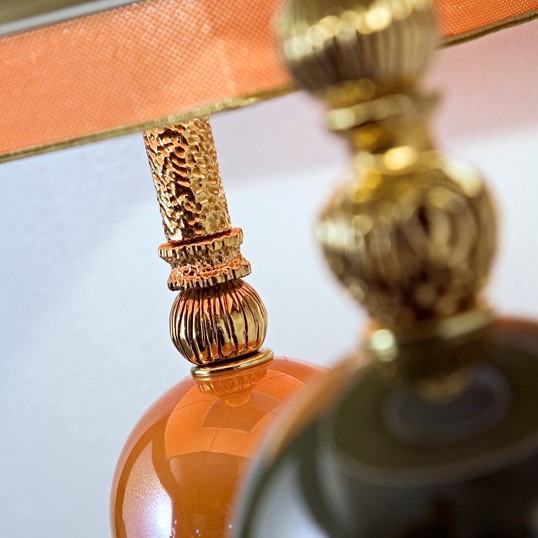 Lamp in gold plated, hand engraved and decorated majolica. Coloured bronze details. Glossy-black lacquered wooden base. Double gold “lux” silk over coloured silk lampshade.