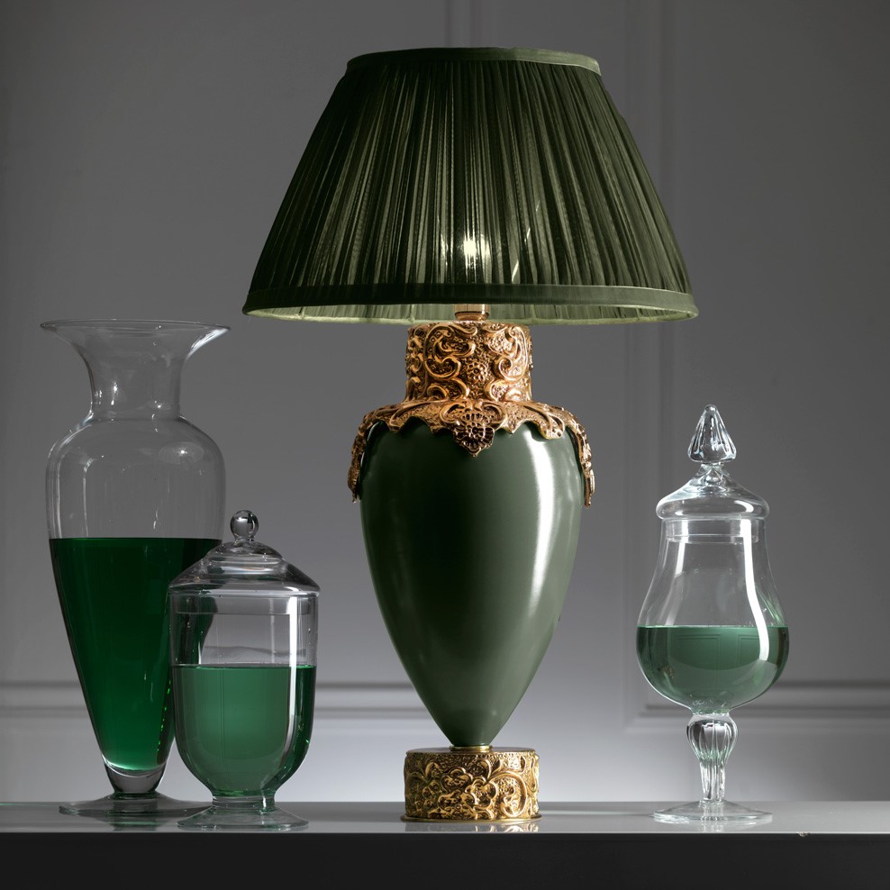 Majolica lamp, real gold plated, hand engraved and glazed. Pleated green silk lampshade.
