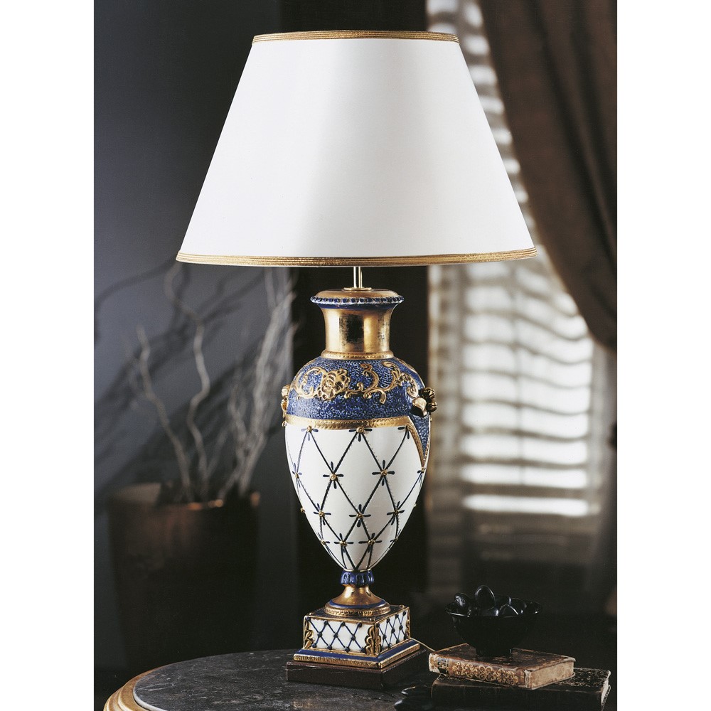 Hand engraved majolica lamp, decorated with glazes and gold. Ivory silk lampshade.
