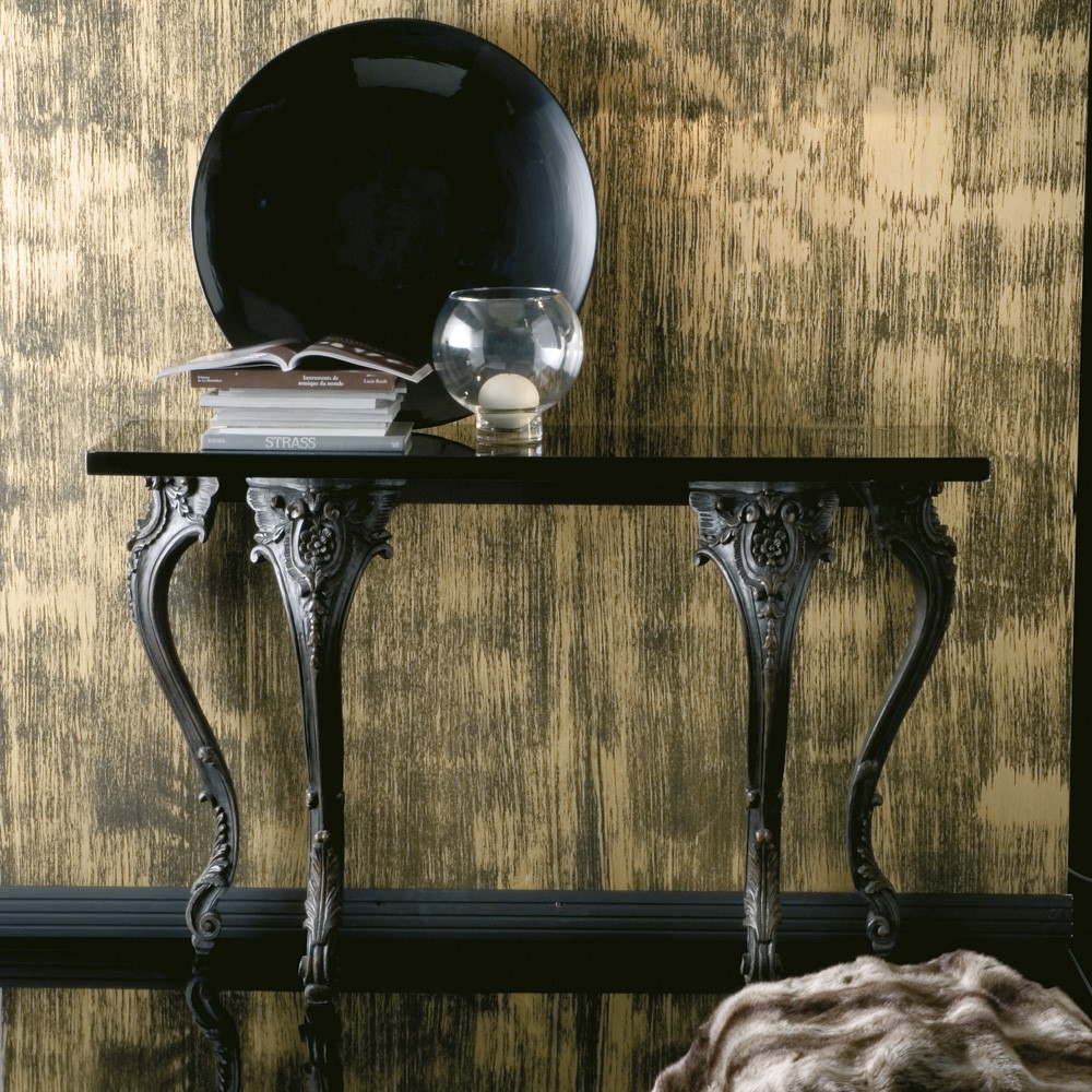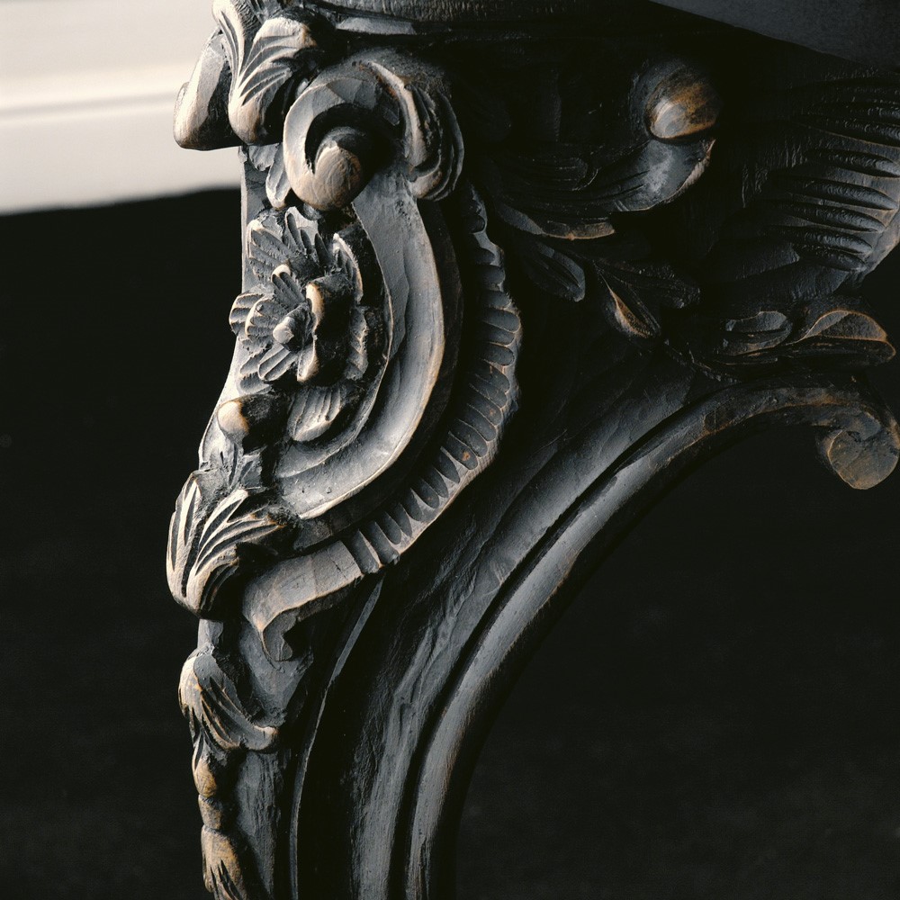 Wooden console table with hand carved, brown decorated legs. Glossy-black lacquered wooden top.