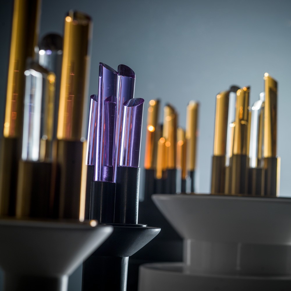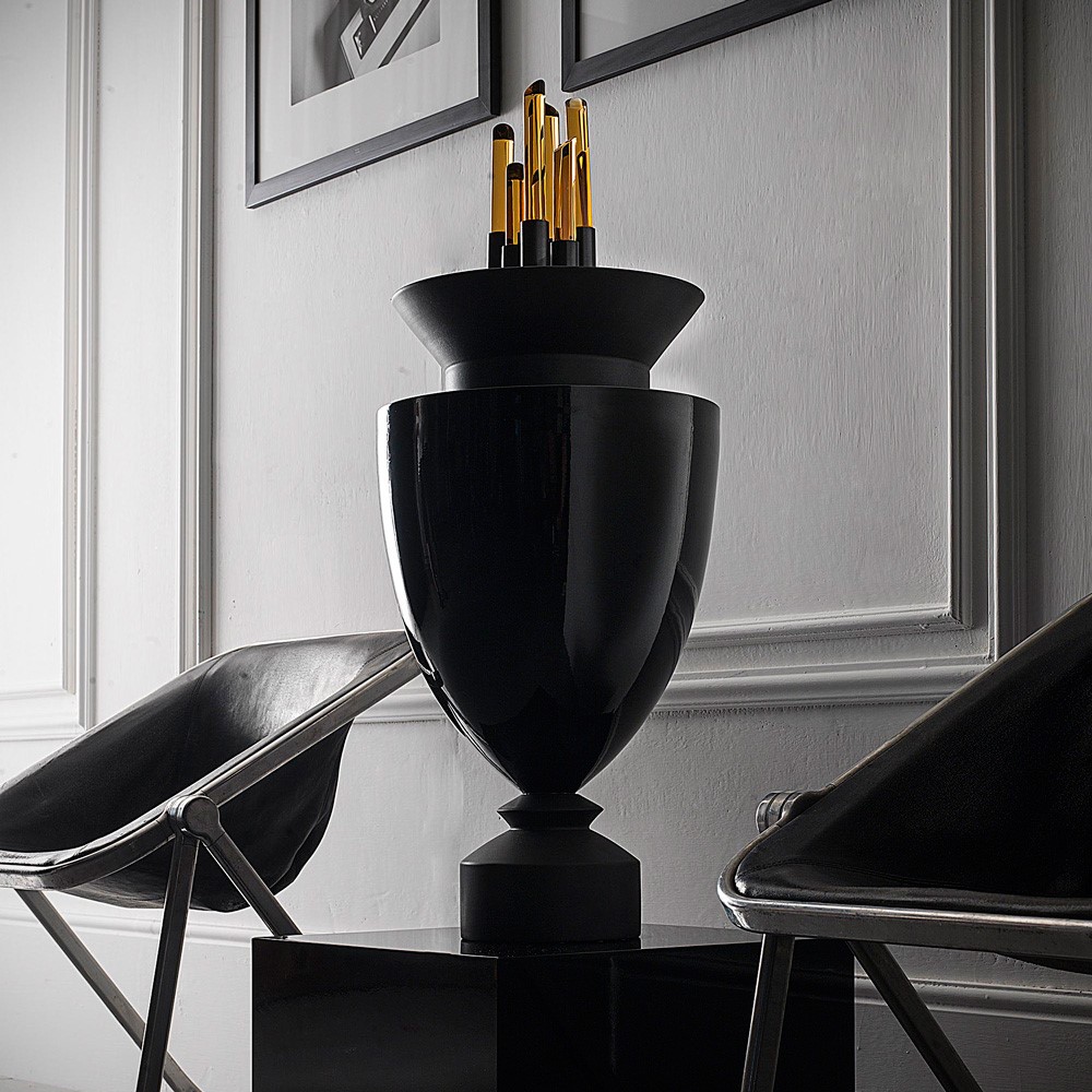 HISTORICAL ITEM OUT OF PRODUCTION - Majolica potiche, hand turned and glossy-black, satin-black lacquered. Fumé grey brass upper part and amber crystals.