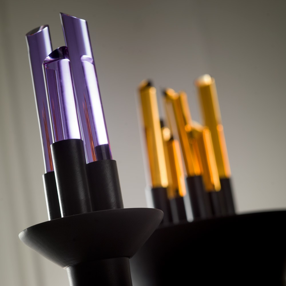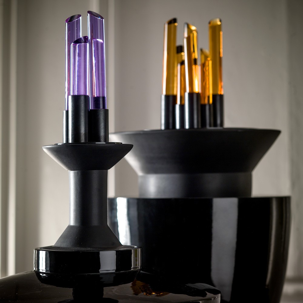 HISTORICAL ITEM OUT OF PRODUCTION - Majolica potiche, hand turned and glossy-black, satin-black lacquered. Fumé grey brass upper part and violet crystals.