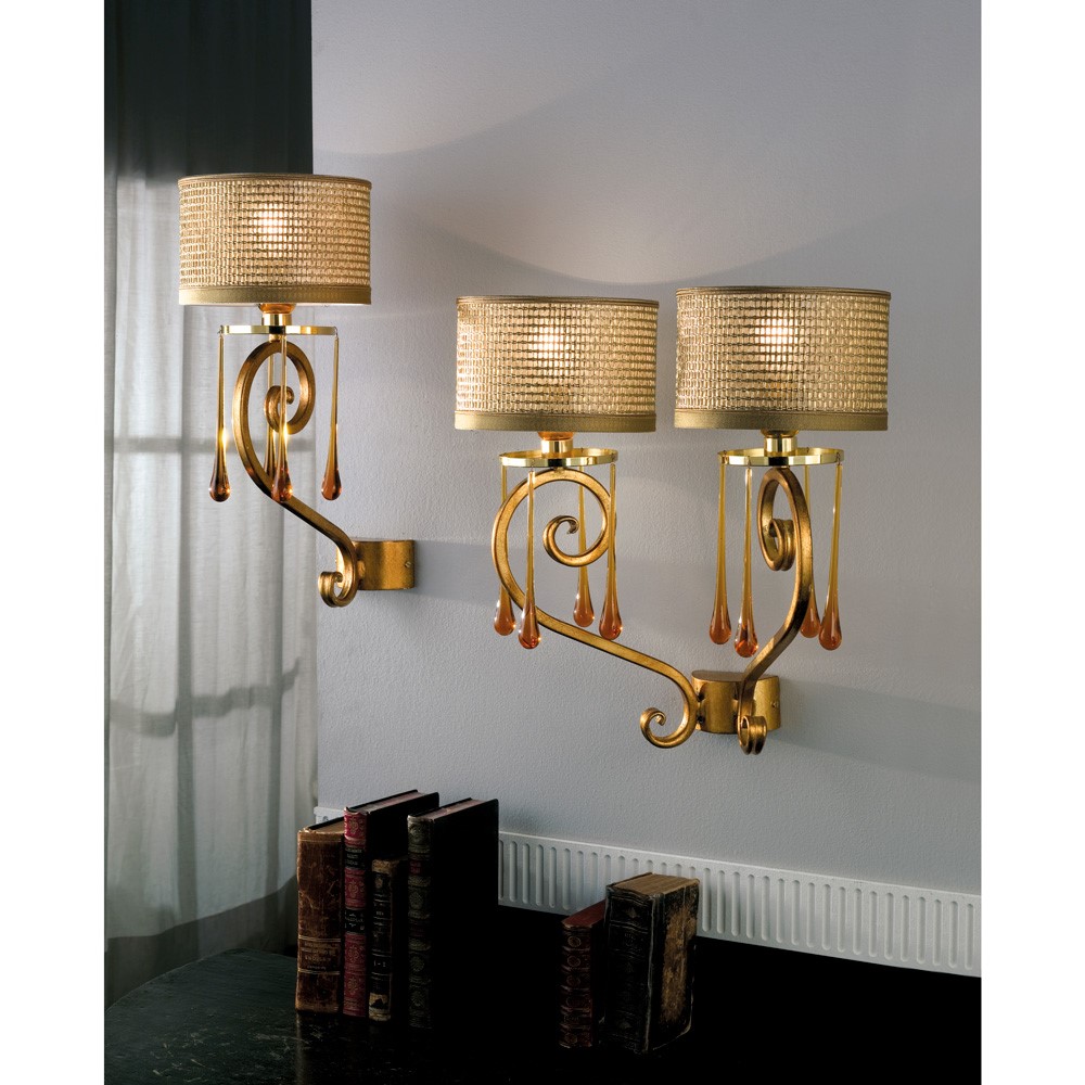 HISTORICAL ITEM OUT OF PRODUCTION - Golden, hand forged wall lamp with amber crystal pendants. Golden “cannette” lampshade.