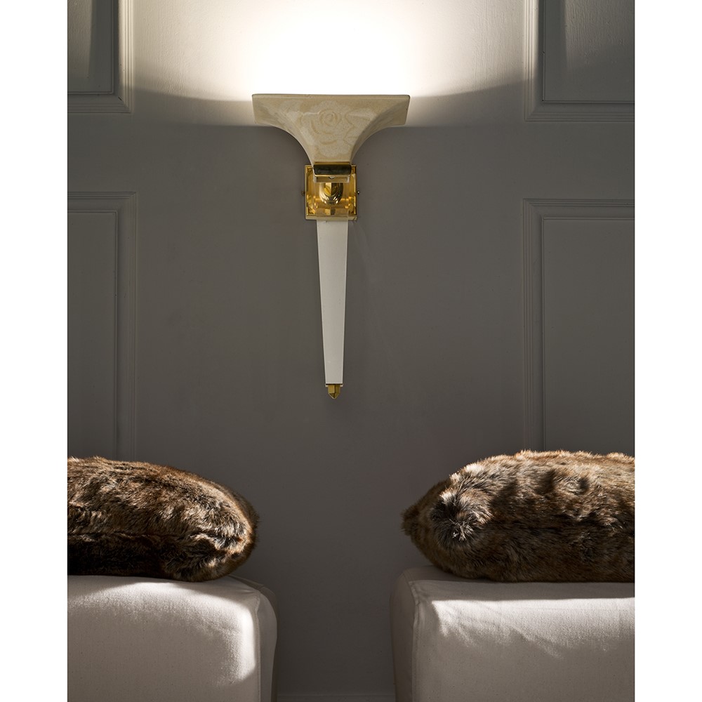 HISTORICAL ITEM OUT OF PRODUCTION - Wall lamp composed by plexiglass and brass shaft, crystal detail and hand decorated majolica cup.