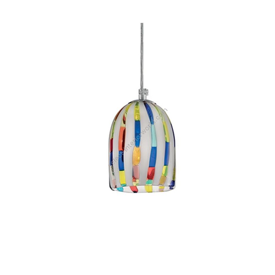 Nine types of textures enrich the simple shape of this bell always different in the strokes, obtained with an ancient decorative hot technique that involves the fusion of rods containing smooth wires in milk white or colored glass. Joyful individually, it becomes the perfect solution for custommade projects with an extremely creative look.