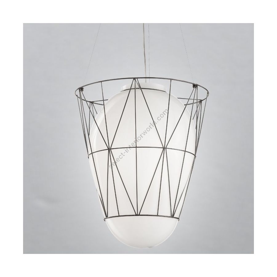Wrapped in a unique cage, developed in a geometric interlocking of threads, the blown glass takes shape in this open net in the lower section. The glass is free to go down and extend, even coming out of the structure, at will of the master glassmaker and punctuated by the temperature of the glass bole. A peculiar workmanship that allows to obtain exclusive works.