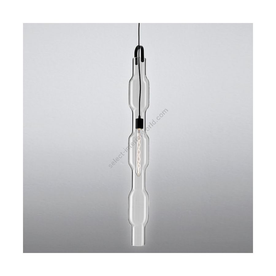 Fluidity, speed: used individually or in theatrical compositions, Venturi stands out for its regular and hypnotic rhythm. Formed by a single body in shaped and ultra transparent borosilicate glass, it is available in two versions where the luminous body moves from the central section, in the vertical version, to the lateral one on the extreme outside, in the horizontal one.