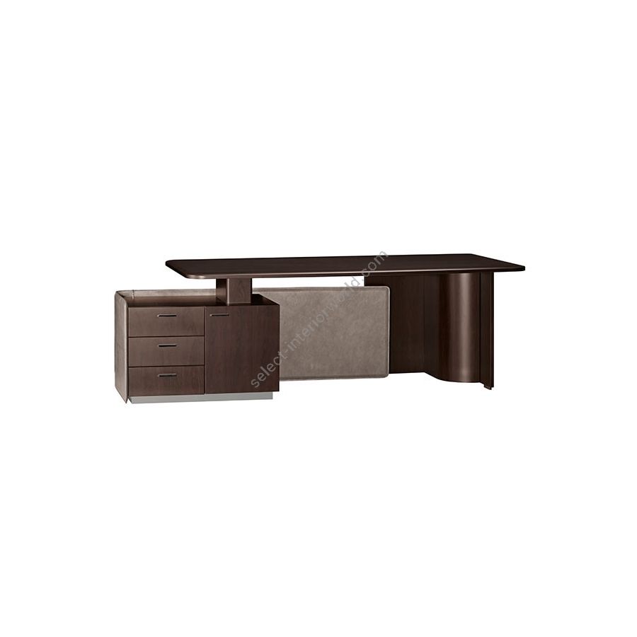 Wenge desk with chest of drawers with leather upholstered side, leather modesty panel, 3 drawers, 1 door, cables hole and steel details with polished black nickel finish.