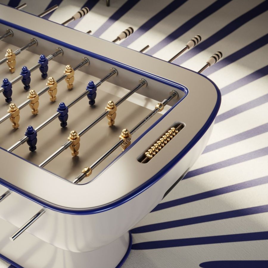 Oskar Foosball Table is proposed in glossy lacquering to enanche its shape. The playing field is in back lacquered tempered glass. The players are in steel, available in 4 finishes or even lacquered.