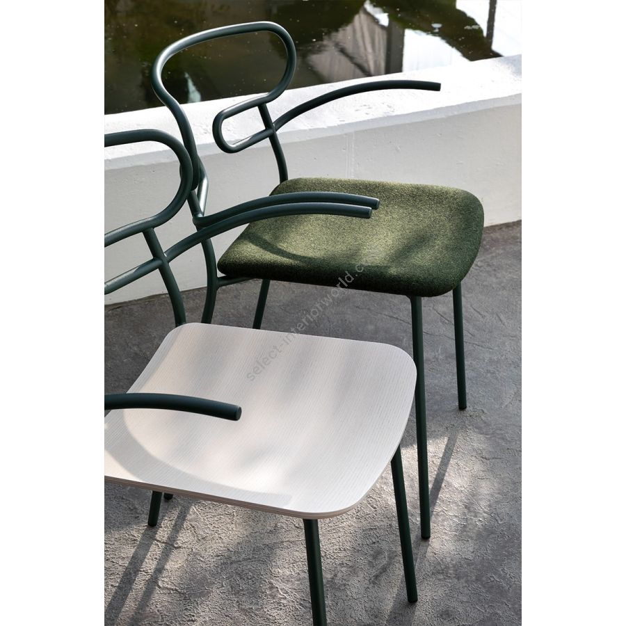 The Genoa chair collection, by talented young designer Cesare Ehr, featuring a stool and a chair with armrests, is also available in an outdoor version. The distinguishing element is the ‘one-line’ backrest, obtained by curving a single metal tube which - with its virtually endless wavy line, also extended to the armrests in this new version - is an elegant addition to every space, bringing a sense of lightness.The outdoor version of the chair will be presented at Salone del Mobile 2019. With integral body in polyurethane, mass painted in the mould, it is also available with a woven backrest in coloured rope to enhance both its look and the level of comfort provided.The frame in powder-coated tubular metal comes in a wide variety of colours; the slightly curved seat - for the indoor versions - is in ash wood (left au naturel or painted) or upholstered with various fabrics, leather or eco-leather.