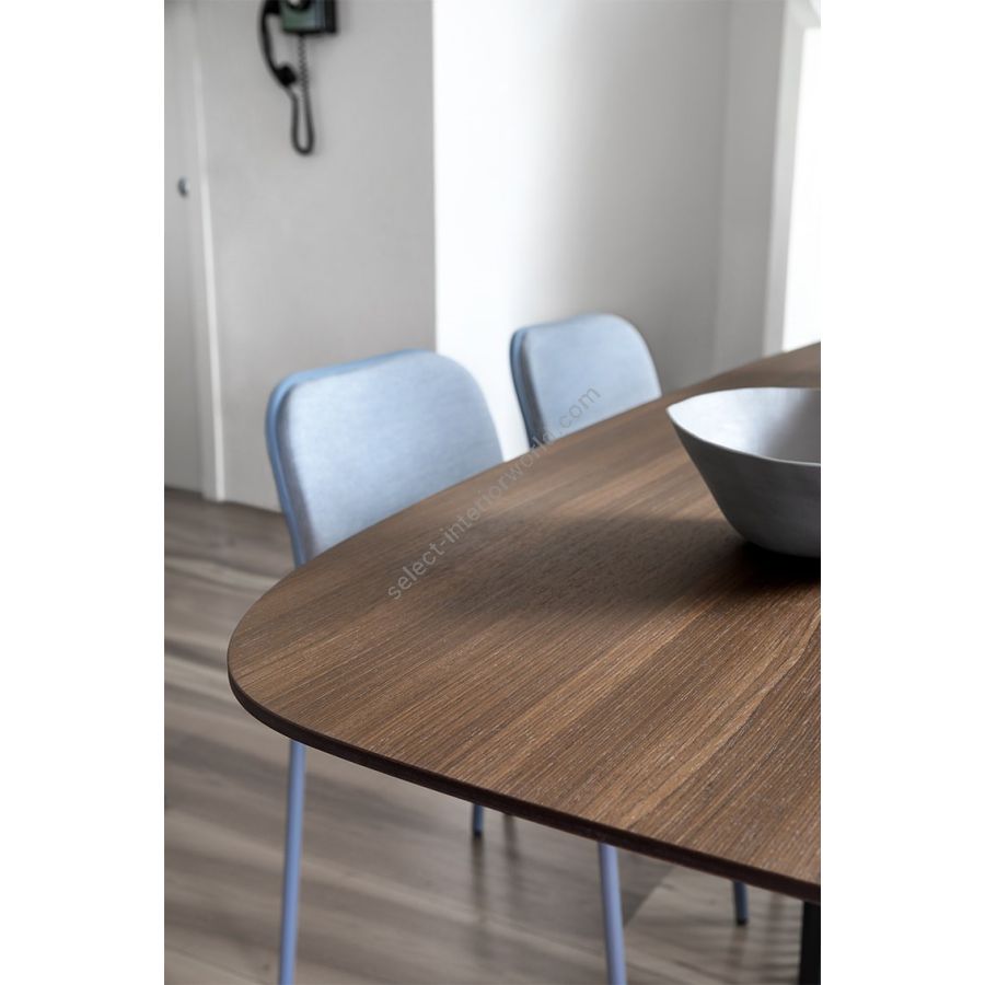 Ray Table is available in ash, oak or heat-treated oak or in glass ceramic, marble or colored HPL.