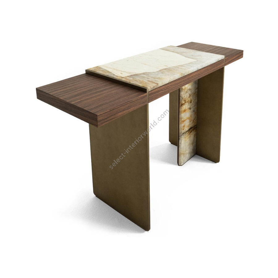 Sophisticated console from the NEXT line available in two versions cm 140 X 45 X h.87 and cm 180 X 45 X h.87 made with different materials: striped grey wood, striped rosewood, BELVEDERE marble, DOVER WHITE marble and PATAGONIA marble. Its style represents a vision: the art of living through furniture and accessories in which design, style, material, new workmanship and tailoring create new aesthetic codes.
