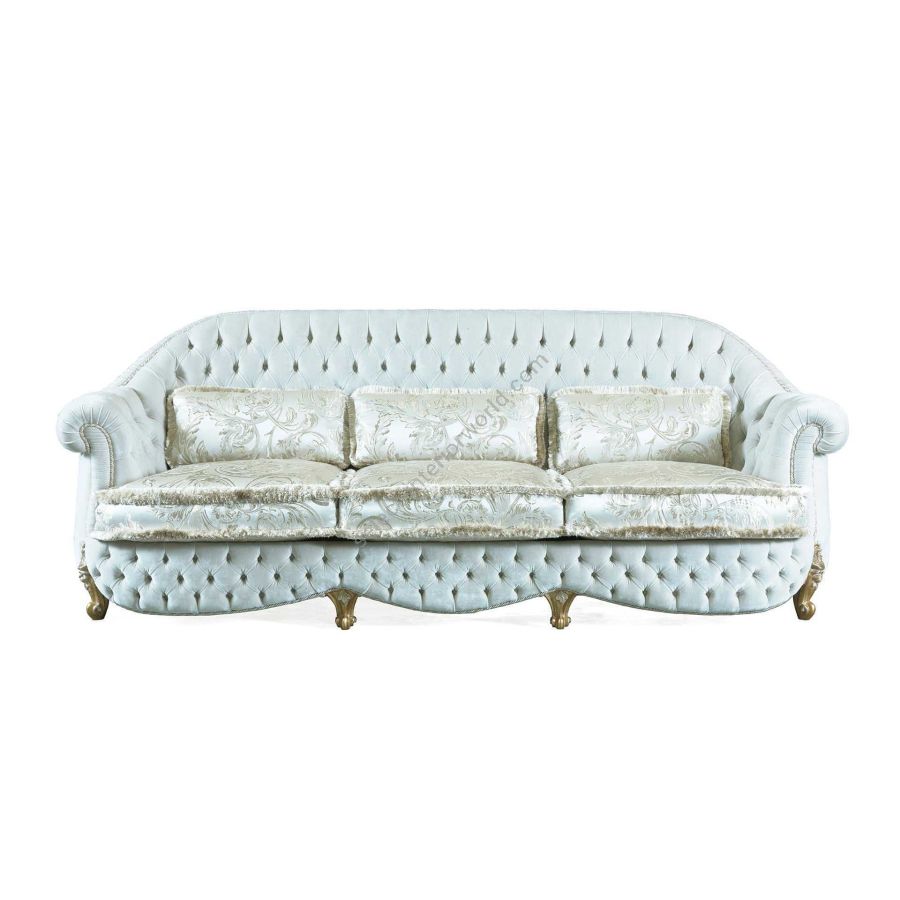 Elegant classic-style living room consisting of a 3-seater sofa, a 2-seater sofa and an armchair with capitonné upholstery and elegant gold finishes on the feet.
