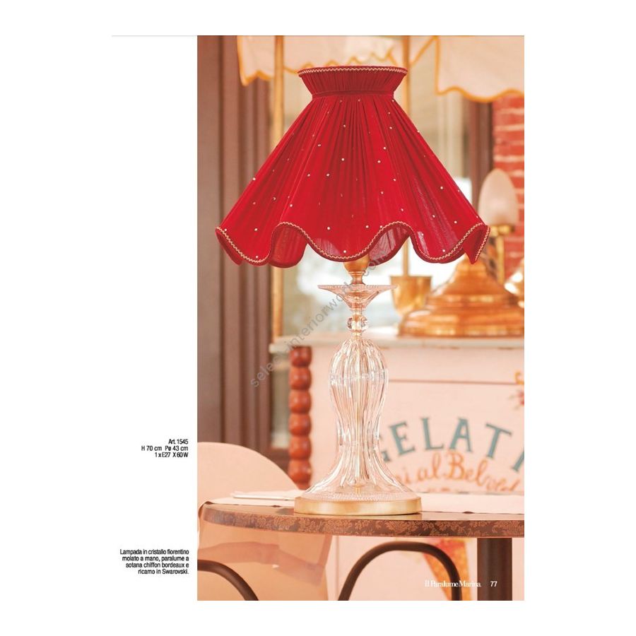 Lamp in hand-cut Florentine crystal, burgundy chiffon skirt lampshade and Swarovski® embroidery. Lighting fixture that diffuses the light into the surrounding environment with great effect, creating a warm and welcoming atmosphere.