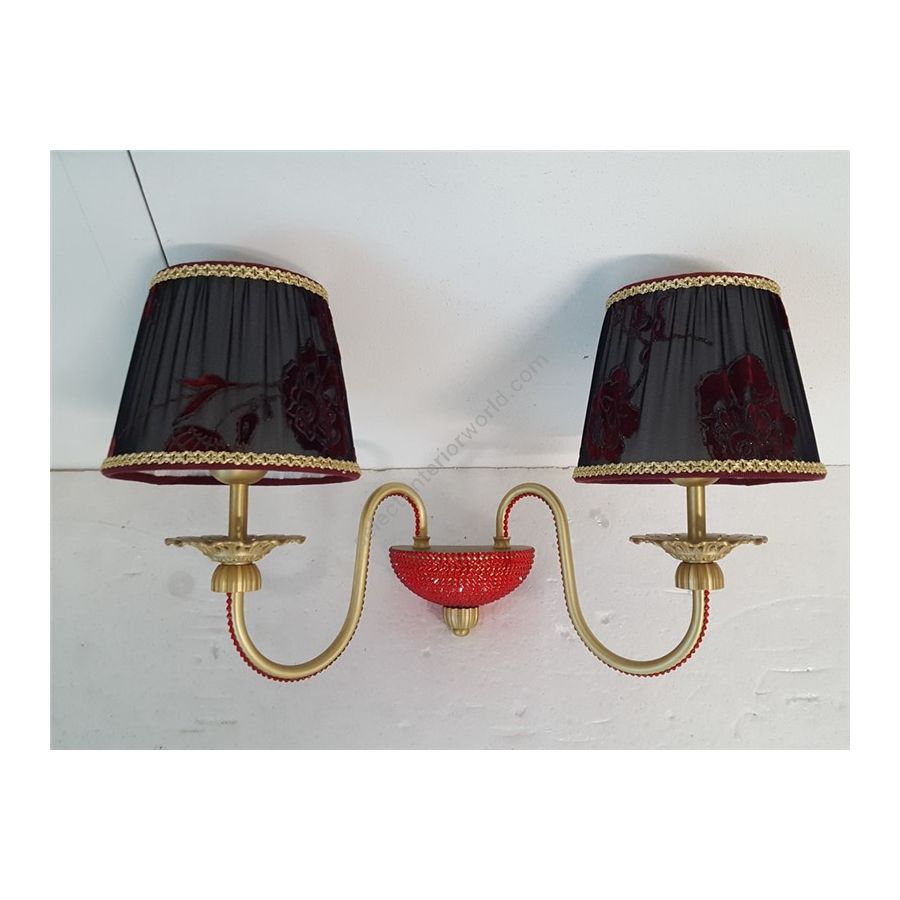 Wall lamp in brass with application of strass and fabric lampshades. Lighting item that diffuses the light with great effect in the surrounding environement creating a warm and welcoming atmosphere.