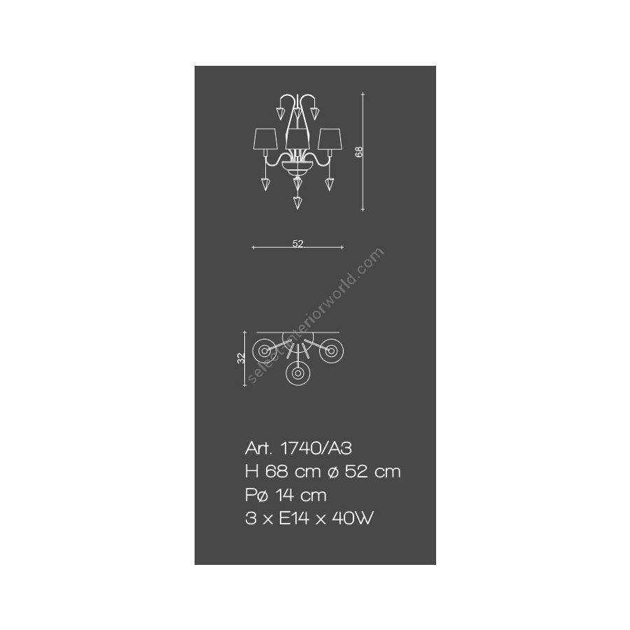 Bulbs: 3 x E14 x 40W| Dimensions (HxWxD): | cm: 68x52x32 / inch: 26.77"x20.47"x12.6" |