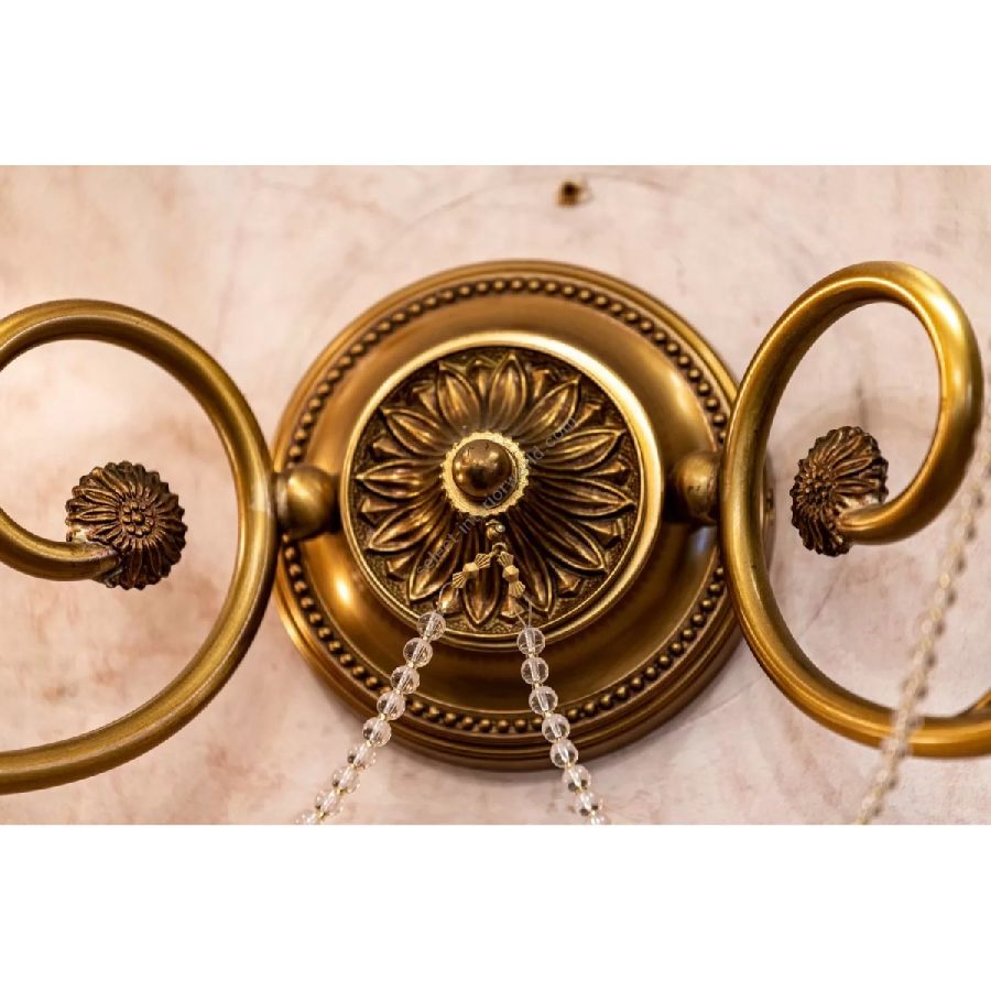 Brass collection in antique French gold finish with crystal drops supported by small daisies, in transparent Schoeler crystal as well, with dove taupe color lampshades. Chandelier and wall lamp can be customized in finishes and sizes.