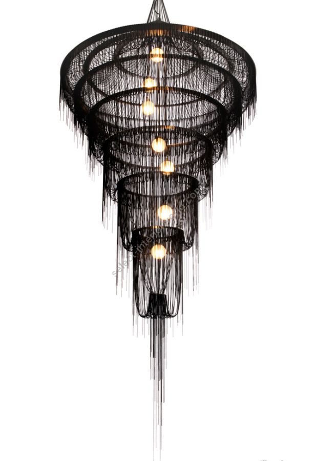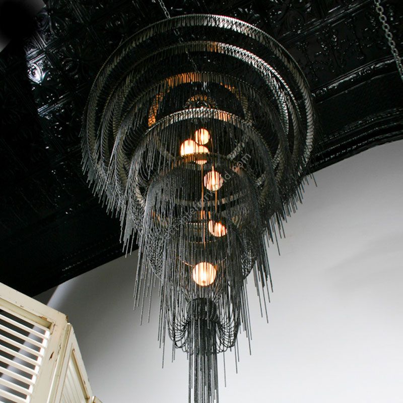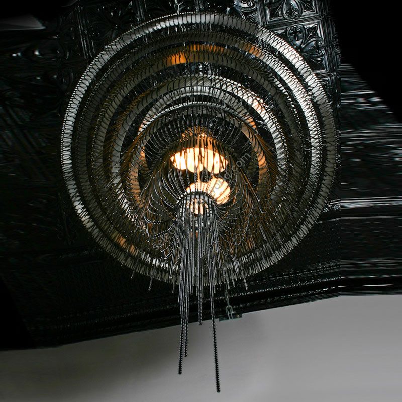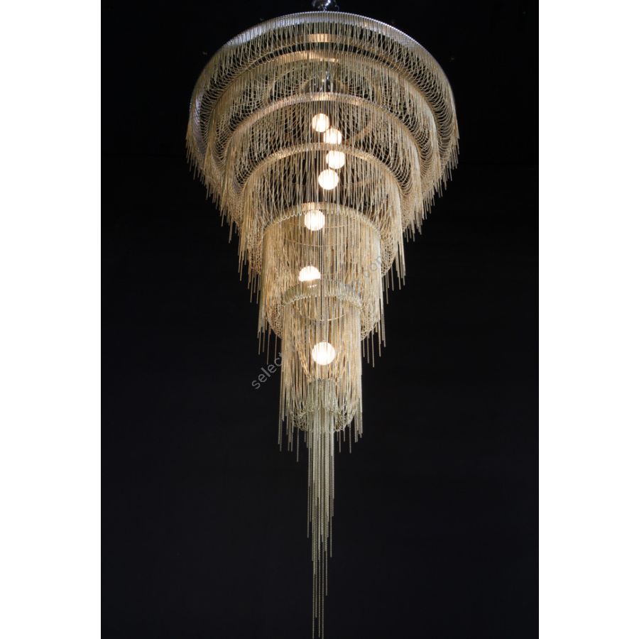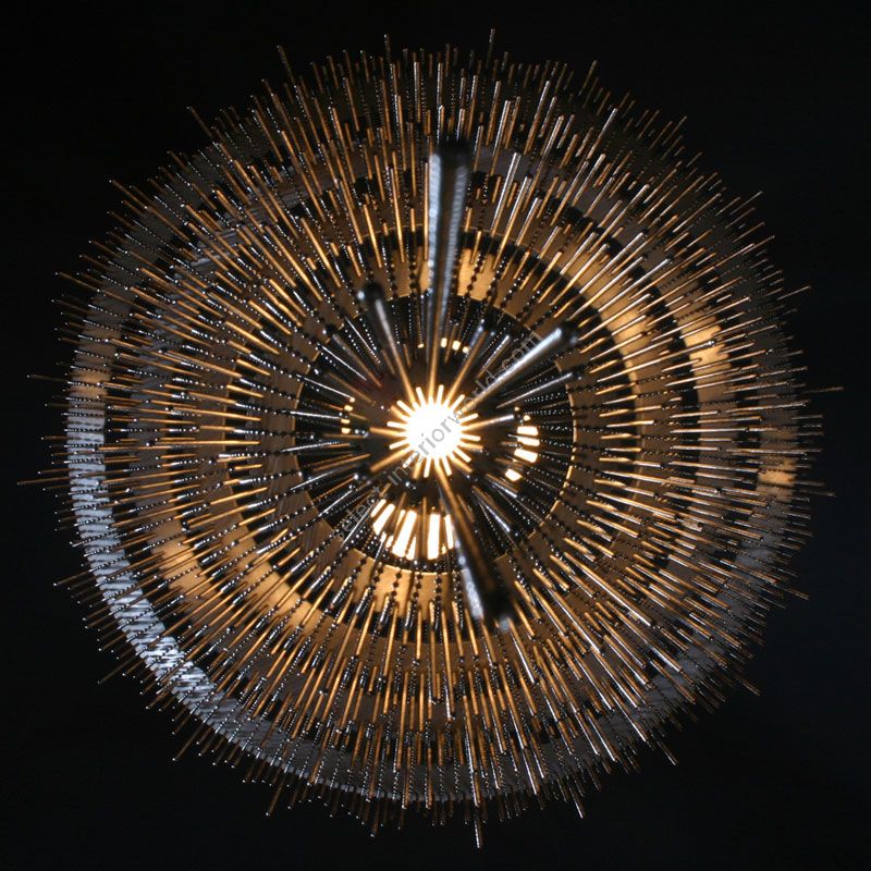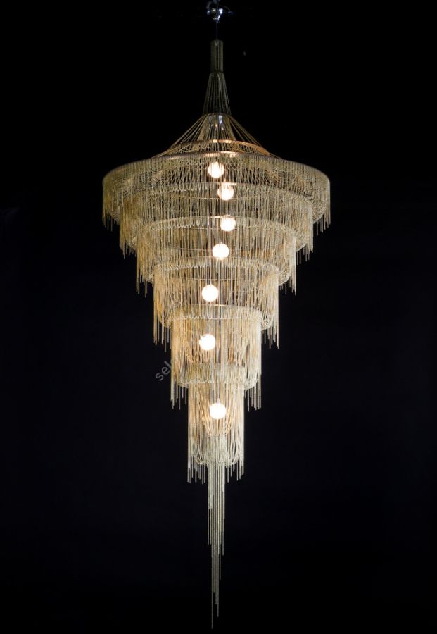 Several cascading rings of stainless steel frames. Illuminated by 5x G9 Halogen or LED lamps in 5 suspended pyrex glass balls in a spiraling formation.