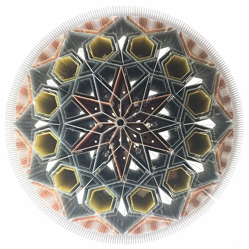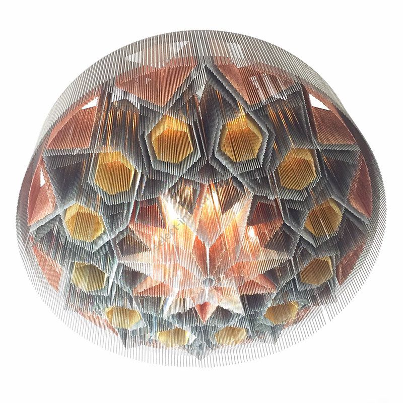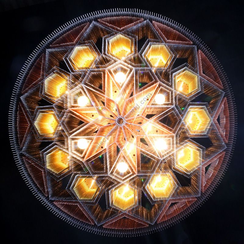 The ceiling mounted version of a massive intense Illuminated Mandala sculpture inspired by Islamic patterns which have been translated into three dimensions through the extrusion of the complex interlocking geometry. Illuminated by a combination of surface mounted and suspended G4 Halogen or LED lamps. Mandala No.2 is a `shallower` version than Mandala No.1 with a more evident pattern from any angle.
