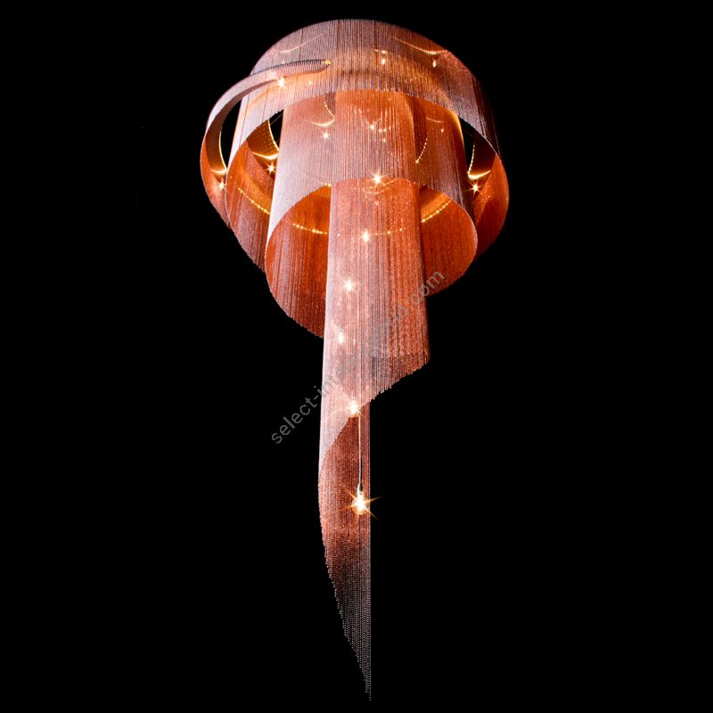 A Spiralling art-chandelier inspired by a holographic image of a cone shell. Illuminated by 3 electrical systems. Two are G4-Halogen or LED based and the other is a 5m long LED striplight. Ideal for a large volume space or a stairwell.
