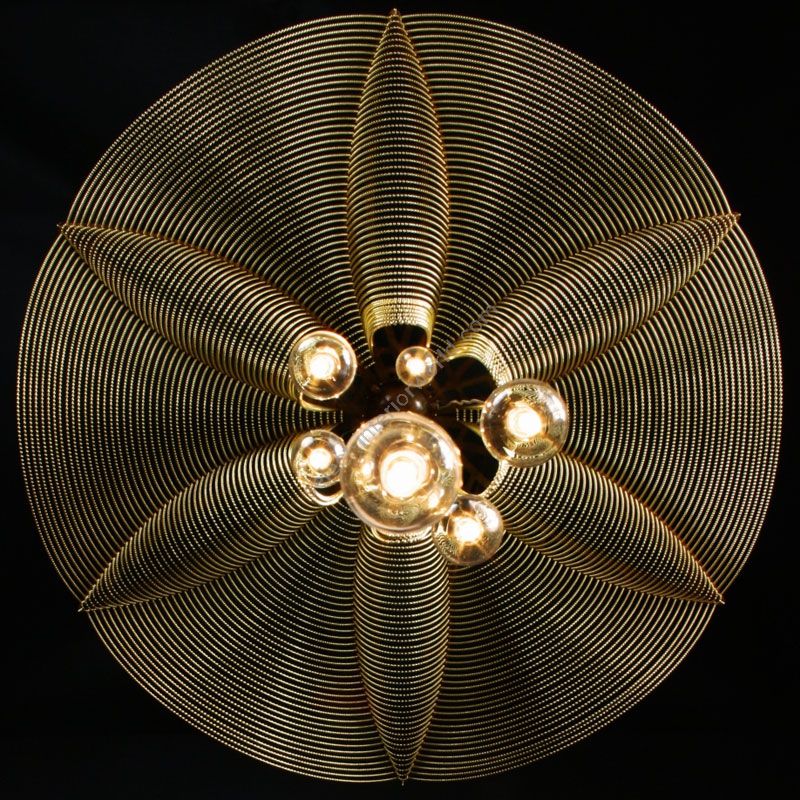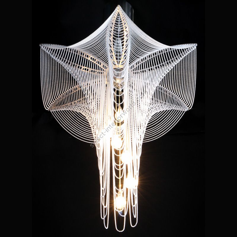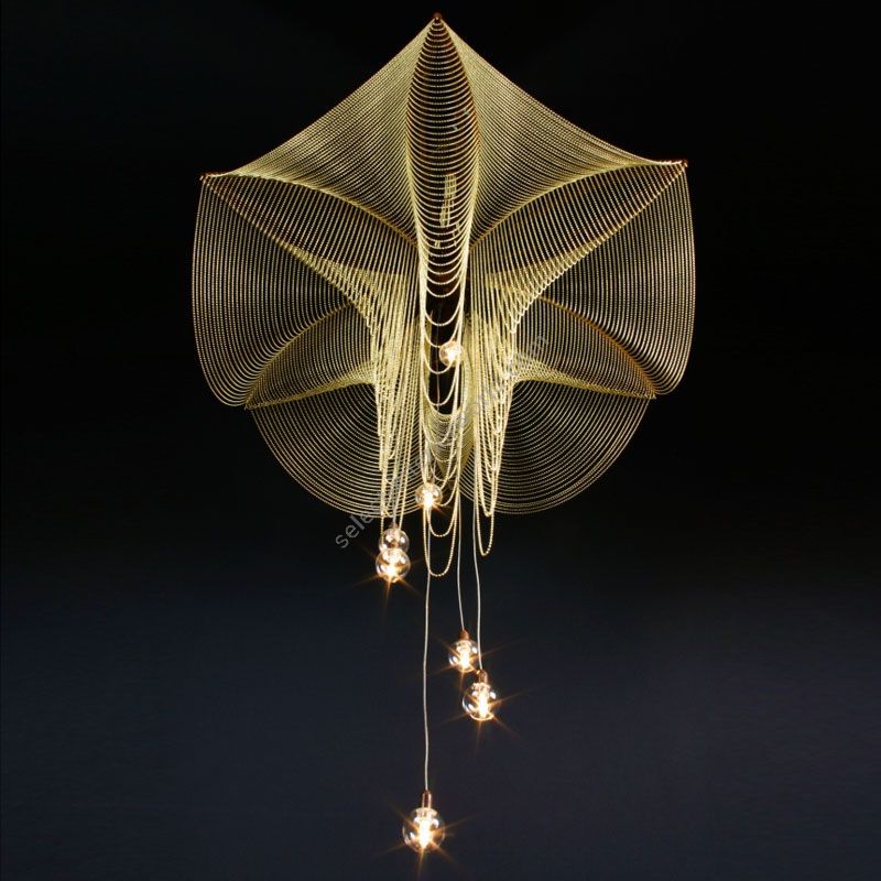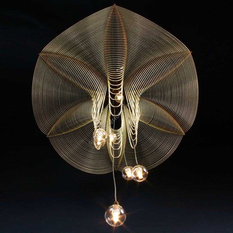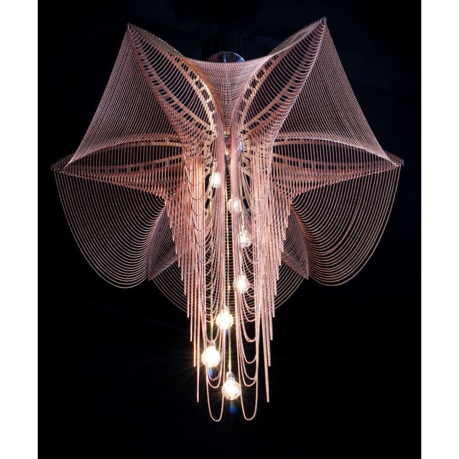 A chandelier design based on the form of Fuschia flowers. Illuminated by suspended spiralling arrangement of 5 pyrex glass balls containing G4-Halogen or LED lamps.