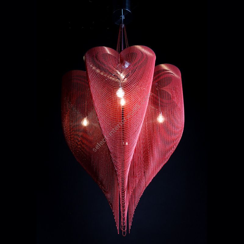 A four leaf clover design translated into a voluptuous and sensual heart shaped chandelier form. Illuminated by 5 G4 halogen or LED lamps in suspended Pyrex glass balls.
