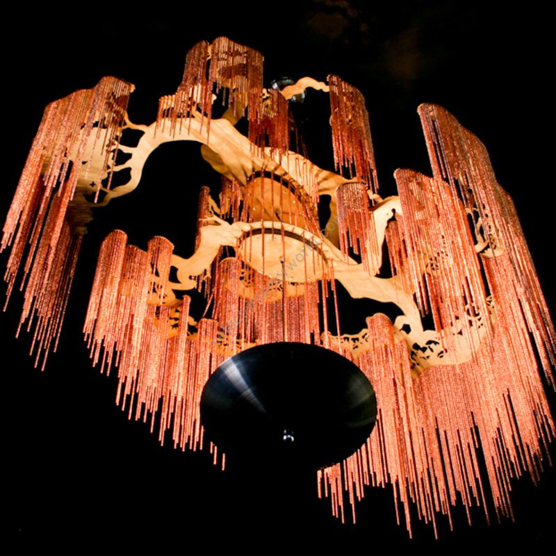 A scupltural tree art-chandelier constructed from a series of four (4) bowing, counterbalancing branches hanging from one another down a central `trunk`. Illuminated by 2 electrical systems one using 4 G9 Halogen or LED lamps at nodes between branches and another using 3xGU.10 Halogen or LED spotlights housed in a suspended uplighter dish.