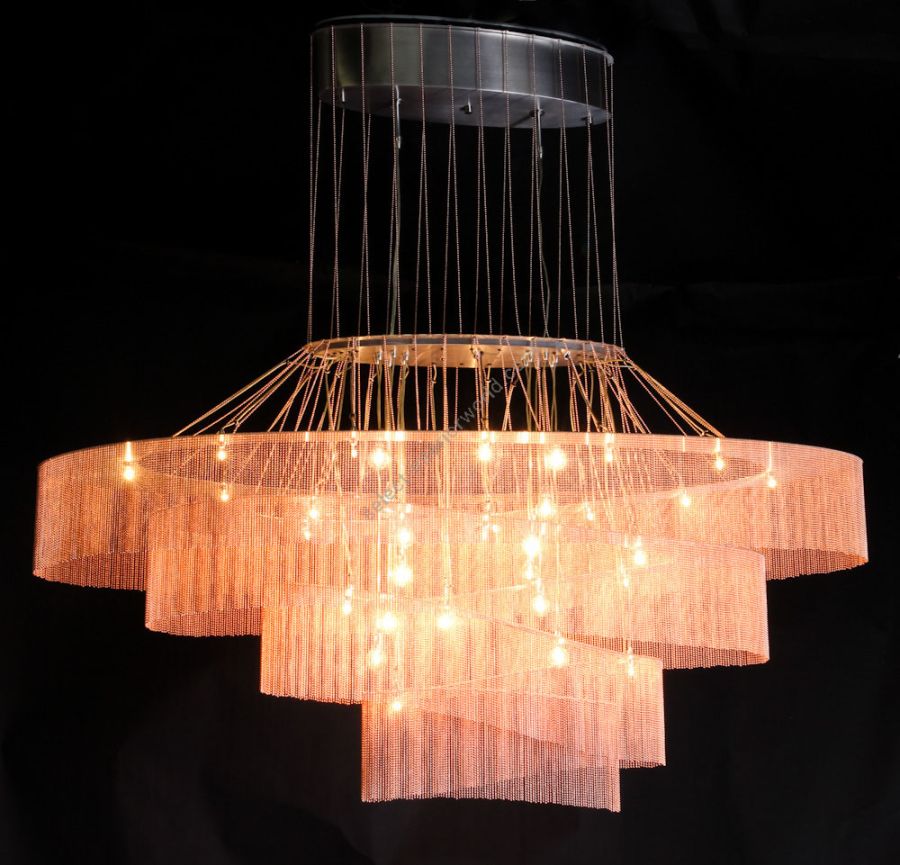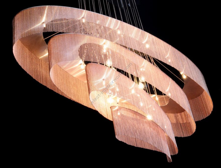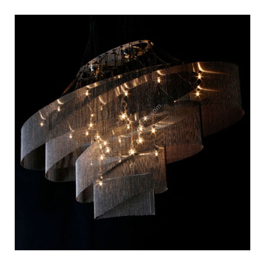 Elongated spiralling art-chandelier inspired by galaxies. Illuminated by 10W G4-Halogen or LED electrical systems one with 12 suspended glass balls and another with 20 surface mounted lamps on the spiralling metal frame. Ideal for a linear space or over a long table.
