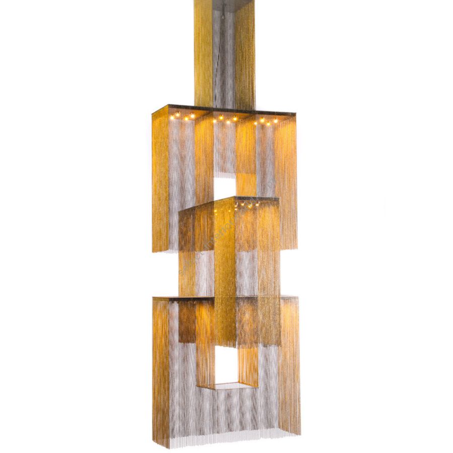 A dramatic, geometric sculptural design resembling abstracted giant links of chain. The use of two chain tones enhances the three dimensionality of the artwork. The design is customizable in that additional links may be added to create an even longer chain. Illuminated by an array of G4 UFO LED’s. Designed by Adam Hoets in 2018.