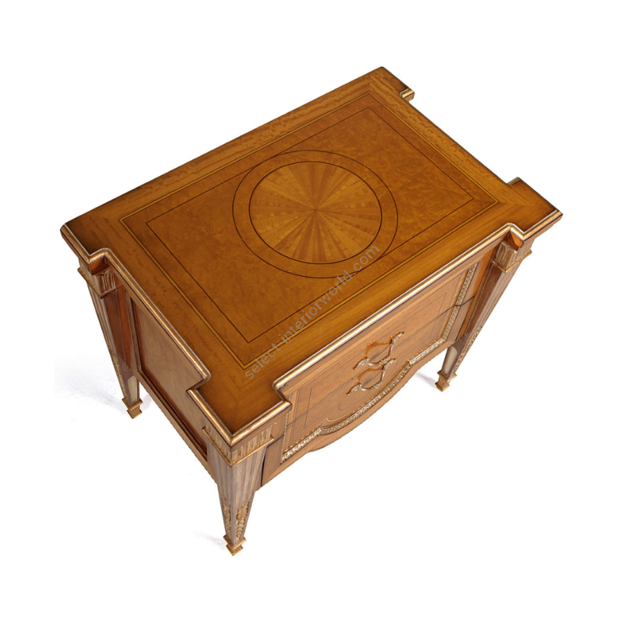 Sophisticated inlaid tables in citronnier wood and myrtle burl. The W048/NT bedside tables are offered together with the W048/CH chest of drawers and the W048/DR dressing table.