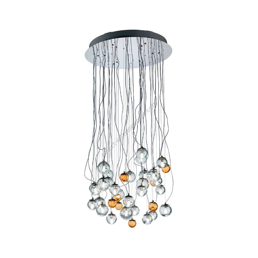 Elegant modern style chandelier with crystal and amber crystal spheres, 36 lights, chrome-finish ceiling plate and steel cables. A play of abstract geometries and suggestive chiaroscuro effects in the environment. Designer lighting to create refined atmospheres.