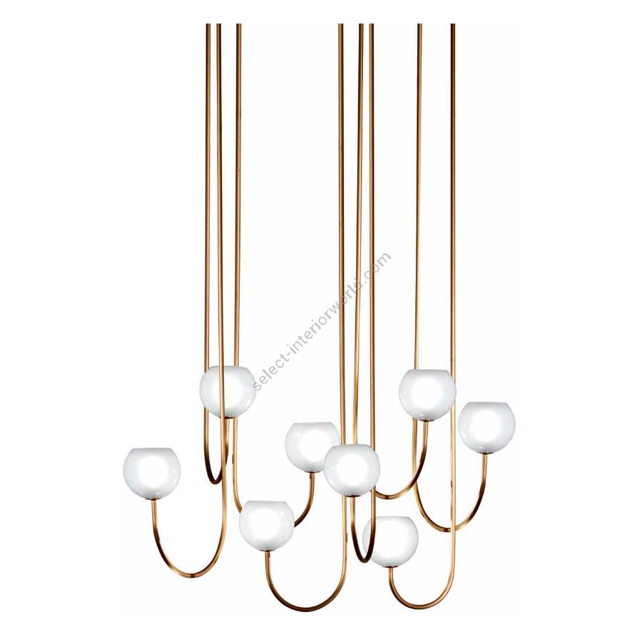 OP 15401-L is a modern style chandelier finished in polished brass. The long arms branch out from the ceiling and with an elegant curve project the light upwards, ensuring diffused lighting. The elegance of its design and the preciousness of its materials mean that this chandelier can constitute a sophisticated accent in any environment.